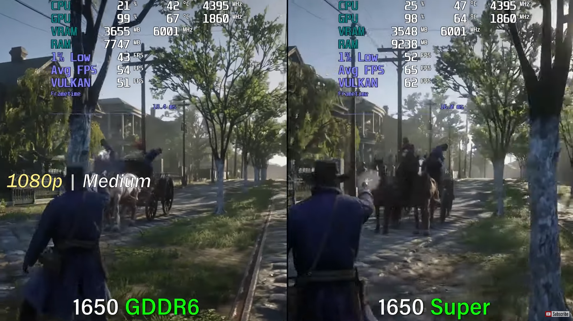 레드 데드 리뎀션 2 중간에서 각 평균 프레임은 54, 65로 이 역시 GTX 1650 Super가 GTX 1650 대비 약 20% 이상 우세한 성능을 보여주었습니다.