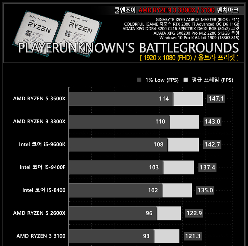배틀그라운드는 최적화가 덜 되어 있기 때문에 CPU의 깡 성능이 중요한 게임입니다. 위 표를 확인해 보시면 라이젠 3300x와 3100은 겉으로 보기에는 똑같은 스펙이지만 한 체급 이상을 벌리는 결과를 보여주었습니다. 라이젠 3300x는 오히려 윗 단계인 라이젠 3500x와 인텔의 i5-9600k와 동급의 성능을 보여주었네요.