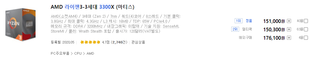 현재 다나와 가격입니다. 가격 차이가 2만 5천원 밖에 나지 않기 때문에 만약 여러분들이 라이젠 3100을 고려하신다고 하면 강력히 라이젠 3300x 가는 것을 추천드립니다. 위에서 보여주듯이 아예 체급이 다른 CPU이니 돈을 더 주더라도 가시는 것을 추천드립니다! 여러분들에게 도움이 될 만한 정보였으면 좋겠네요 :)