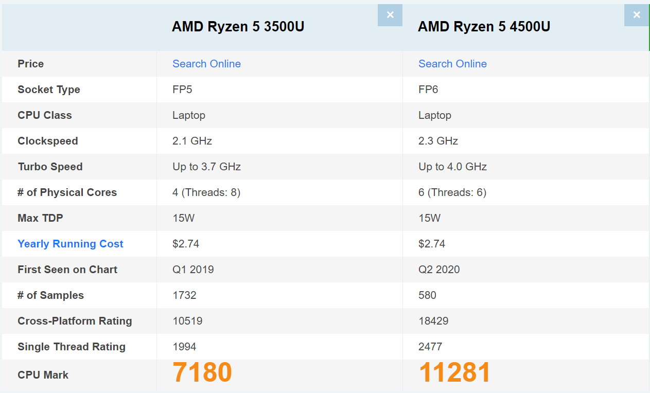 cpubenchmark에서 CPU 비교를 한 결과 라이젠 4500U가 3500U에 비해 약 55% 우세한 결과를 보여주었습니다. 아무래도 세대를 바뀌면서 공정 개선으로 인해 CPU의 싱글 코어당 성능을 크게 늘린 것으로 보이네요.
