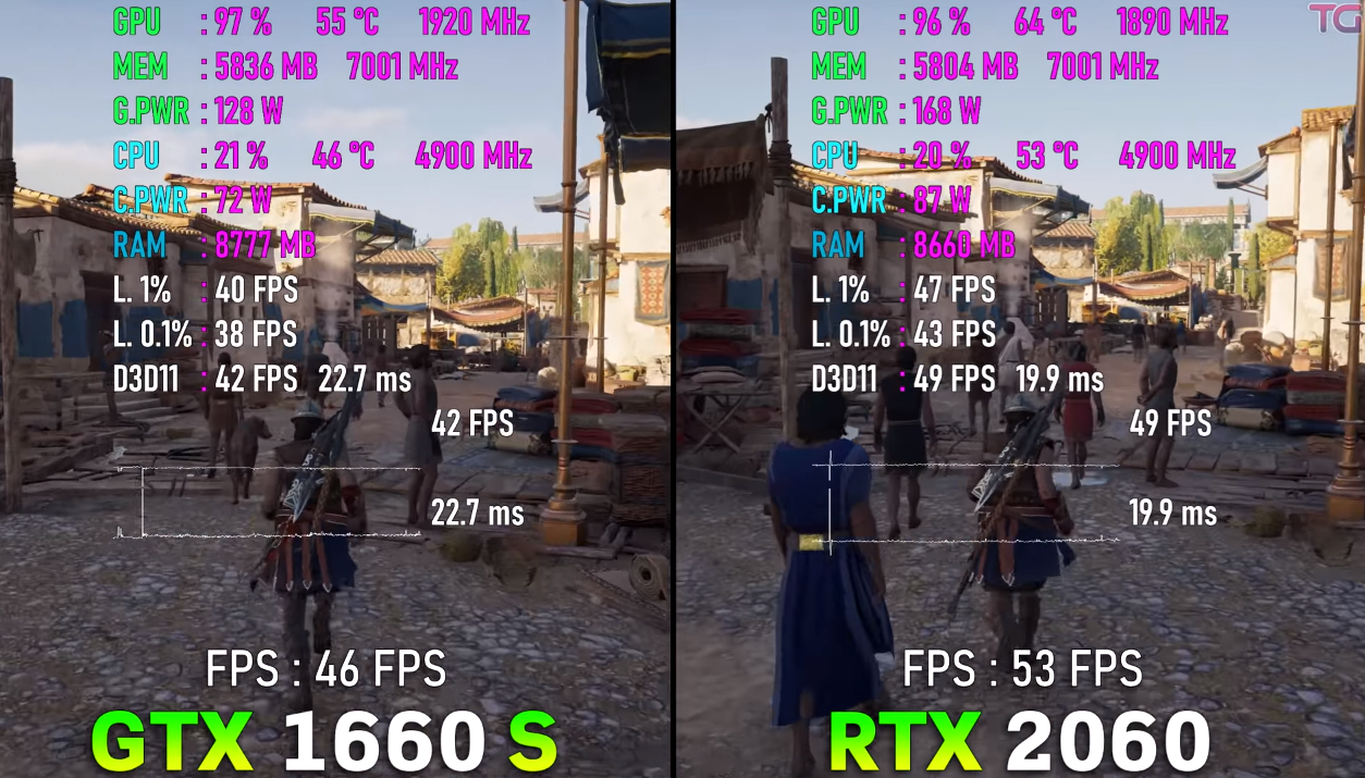 어쌔신 크리드 오디세이 울트라에서 돌렸을 때 각 평균 프레임은 46, 53로 RTX2060이 GTX1660 Super보다 약 20% 우세한 성능을 보여주었습니다.