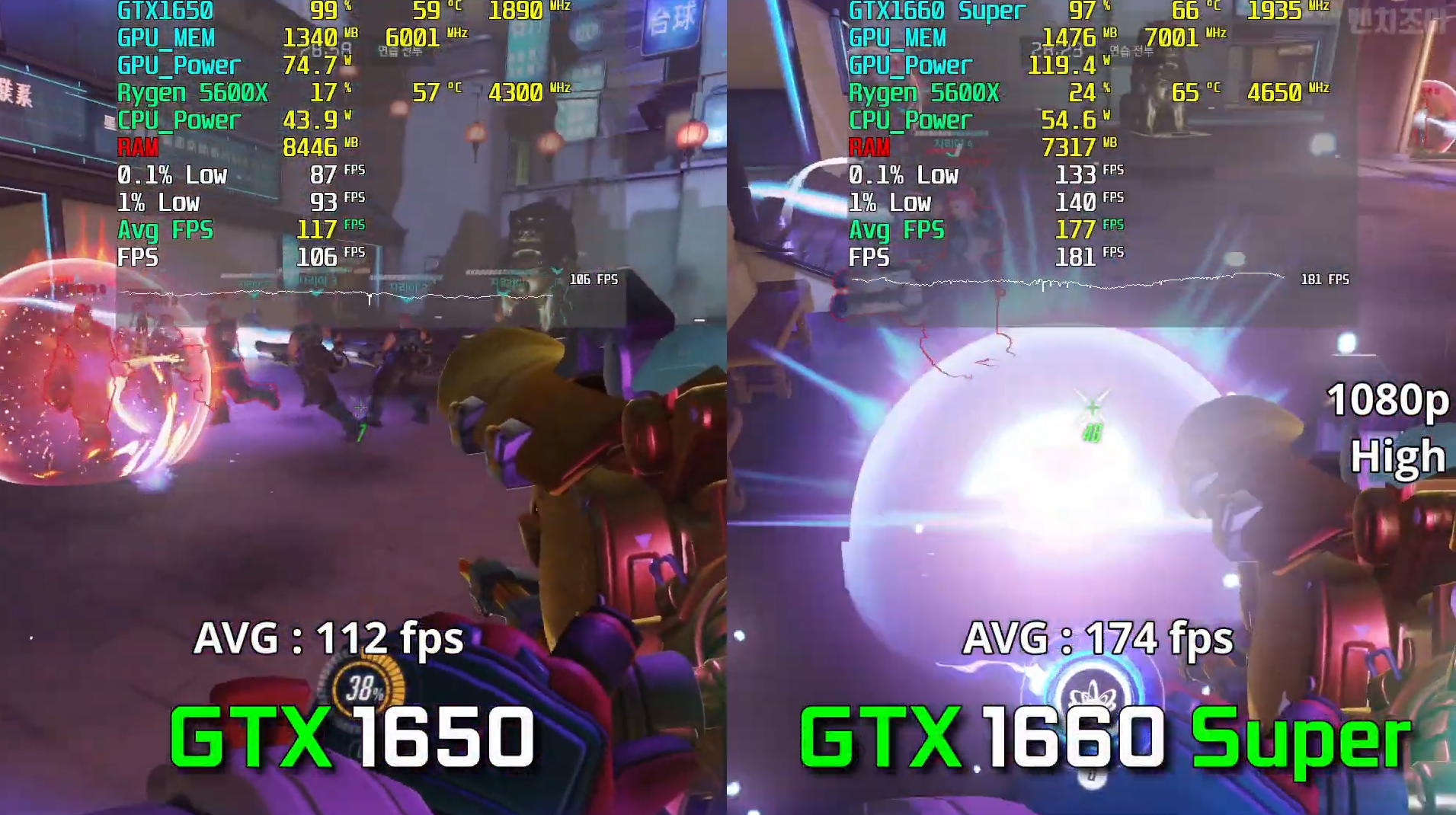 오버워치 높음에서 돌린 결과 각 평균 프레임은 112, 174로 GTX1660 Super가 GTX1650에 비해 55% 우세한 성능을 보여주었습니다. 소비전력이 50% 차이 나는 만큼 성능 차이도 많이 나는 것을 알 수 있습니다.