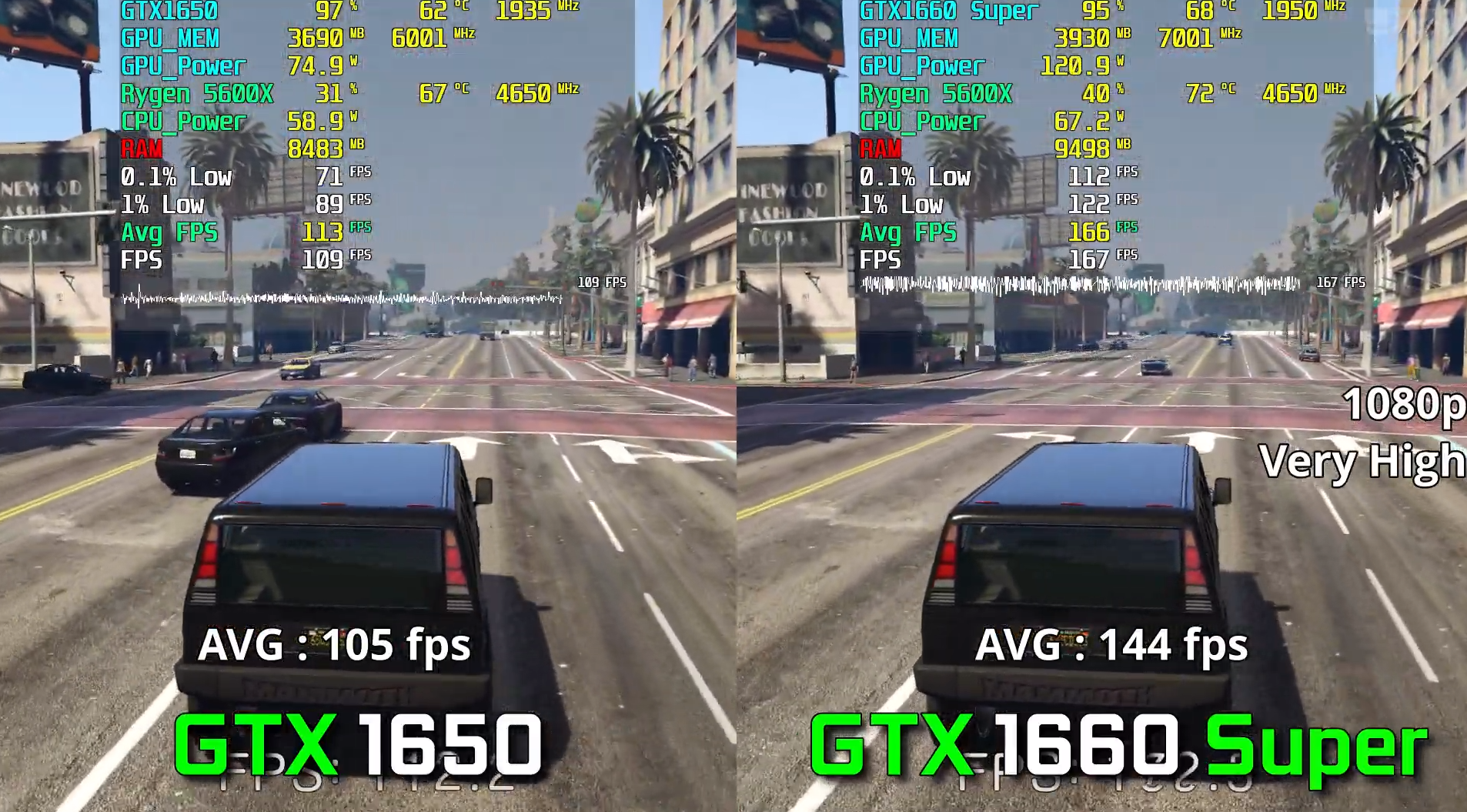GTA 5 매우 높음에서에서 돌린 결과 각 평균 프레임은 105, 144로 GTX1660 Super가 GTX1650에 비해 37% 우세한 성능을 보여주었습니다.
