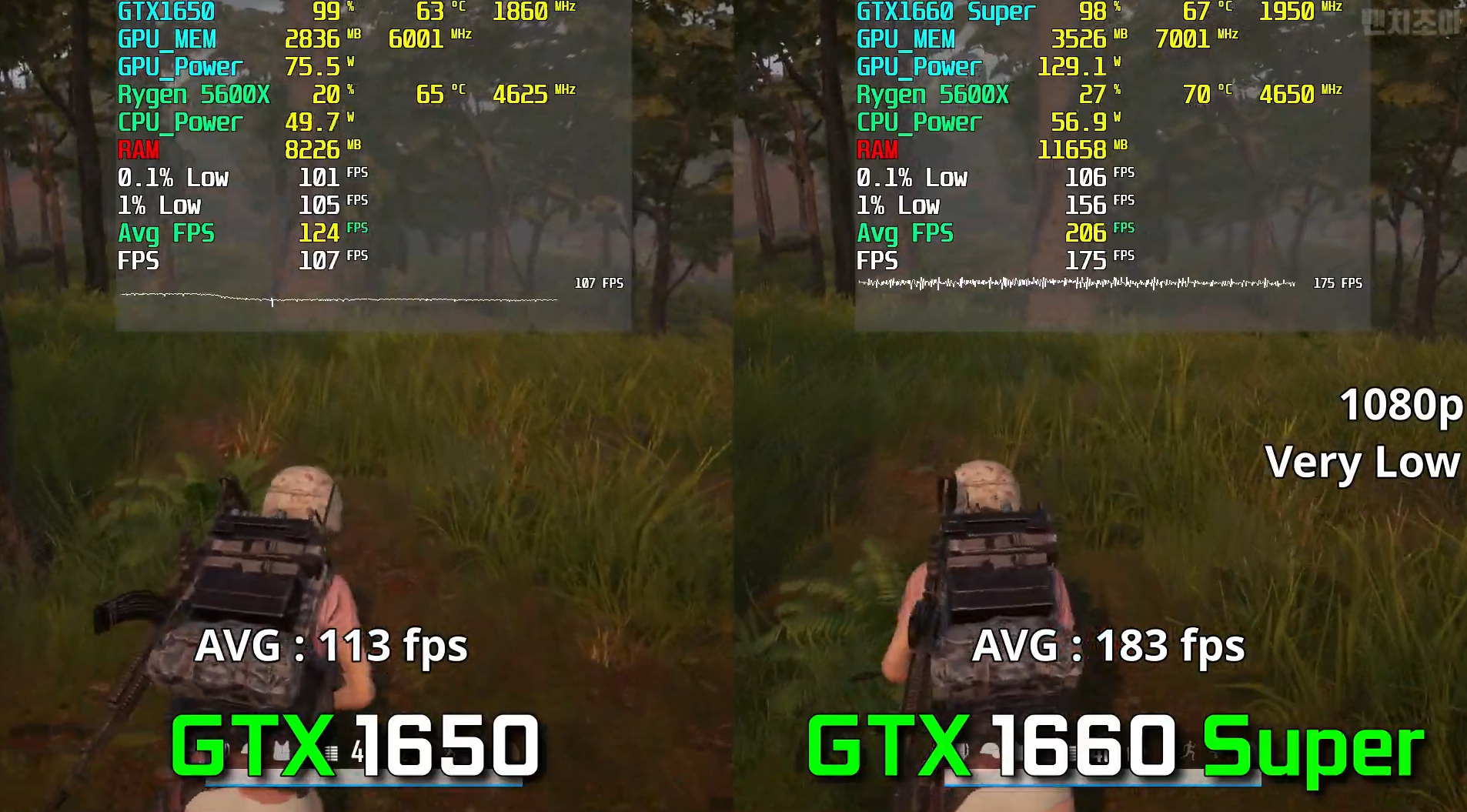 배틀그라운드 국민 옵션에서에서 돌린 결과 각 평균 프레임은 113, 183로 GTX1660 Super가 GTX1650에 비해 58% 우세한 성능을 보여주었습니다.