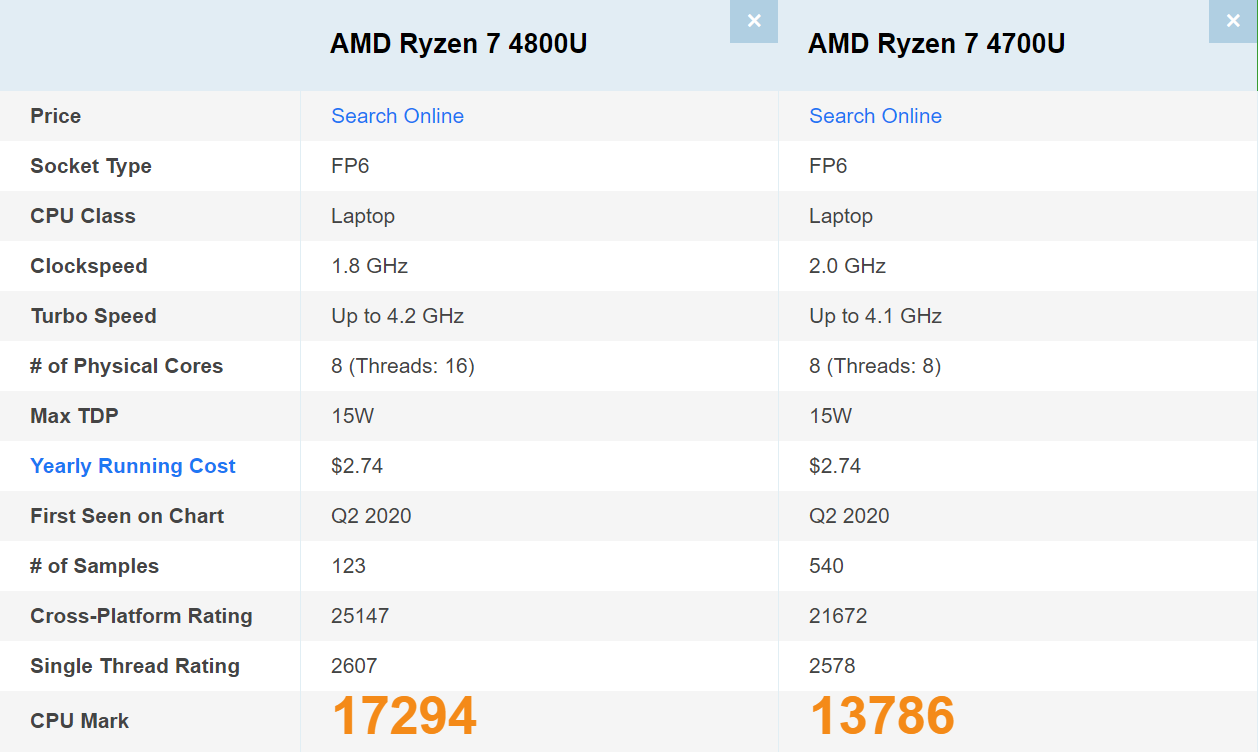 cpubenchmark.com에서 비교한 결과를 보시면 라이젠 4800U가 4700U에 비해 약 25% 우세한 CPU 성능을 지니고 있습니다. 8쓰레드의 유무로 인하여 4800U가 더 앞서는 것을 확인할 수 있네요.