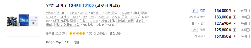참고로 i3-10100F 모델은 2~3개월 전에 10만원에 형성되어 있던 CPU입니다.