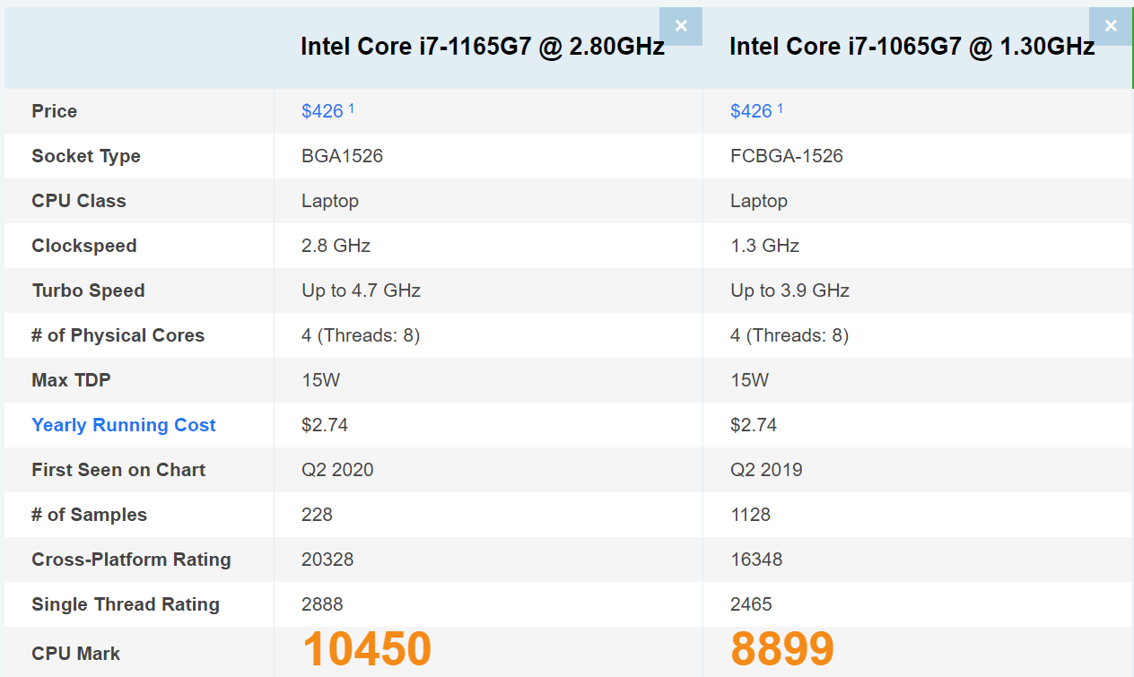 cpubenchmark.net의 결과를 보시면 i7-1165G7가 i7-1065G7에 비해 약 17% 우세한 CPU 성능을 지니고 있습니다. 높은 터보 클럭과 최적화된 공정으로 인하여 나온 결과로 보이네요.
