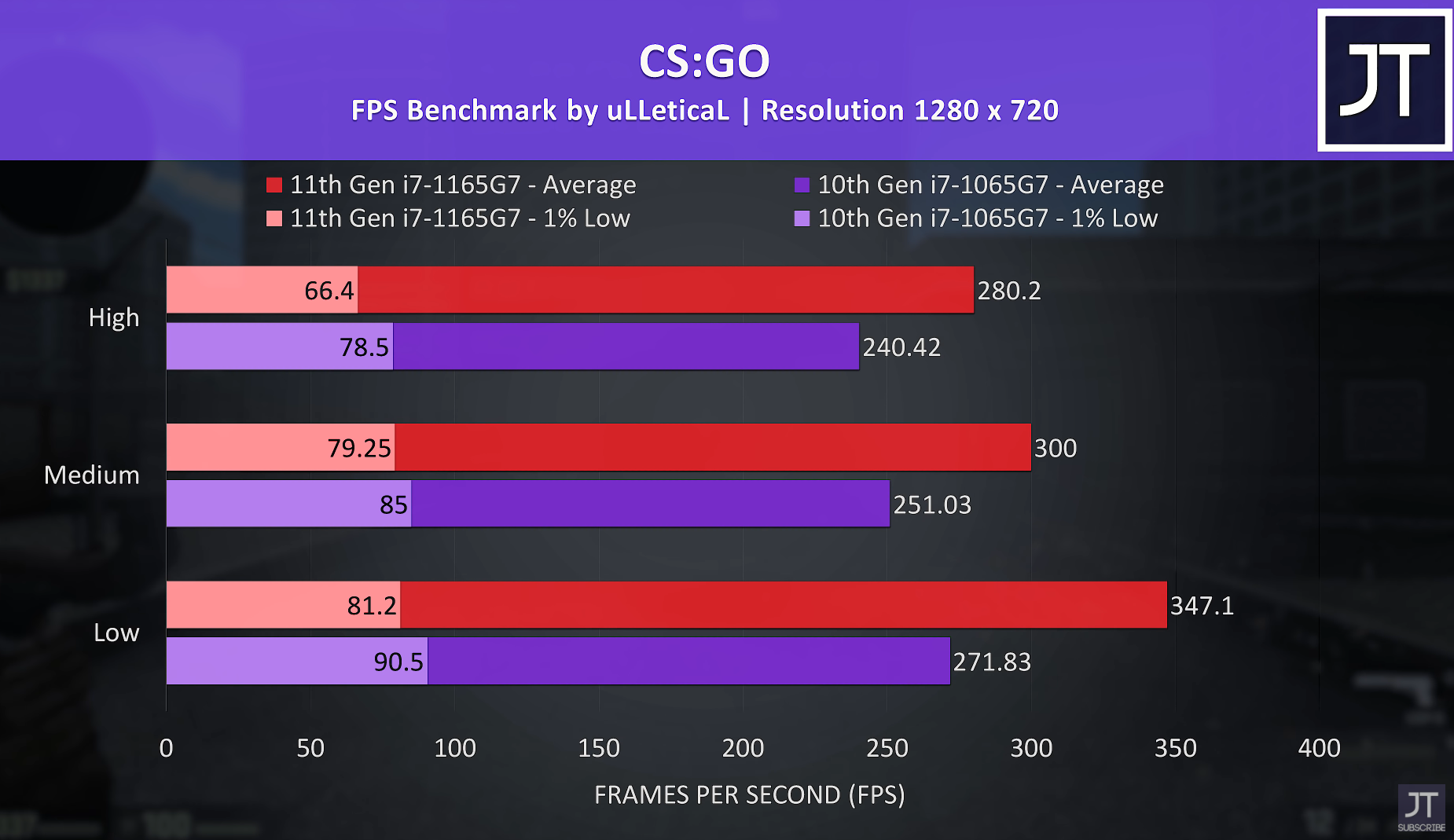 카운터 스트라이크 낮음 기준으로 보시면 평균 프레임이 347, 271로 i7-1165G7가 i7-1065G7보다 약 28% 우세한 성능을 보여주었습니다.