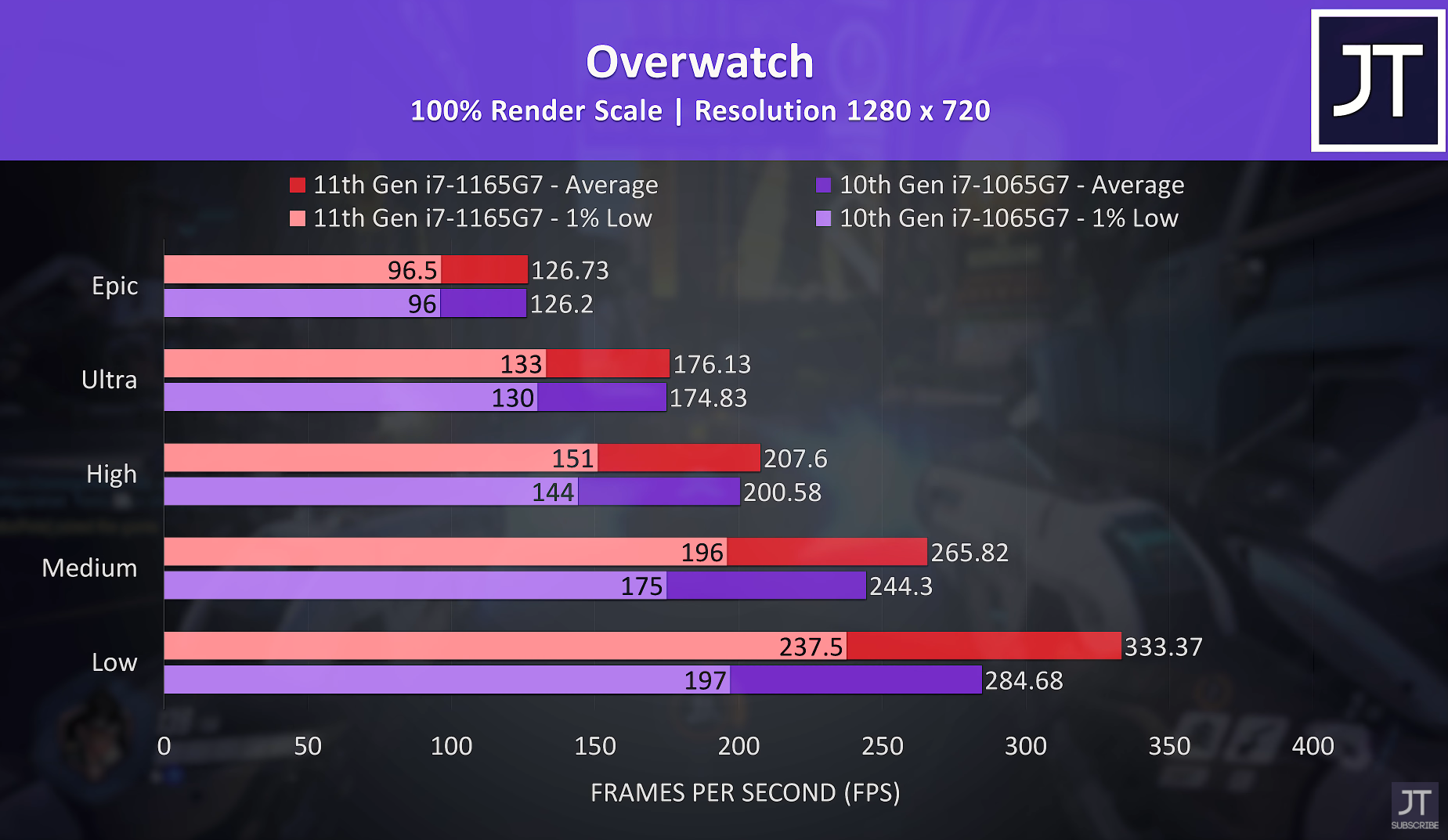 오버워치 낮음 기준으로 보시면 평균 프레임이 333, 284로 i7-1165G7가 i7-1065G7보다 약 17% 우세한 성능을 보여주었습니다. 옵션이 높아질수록 차이가 좁혀지기는 하나, 거의 차이가 없는 것이 신기하네요.