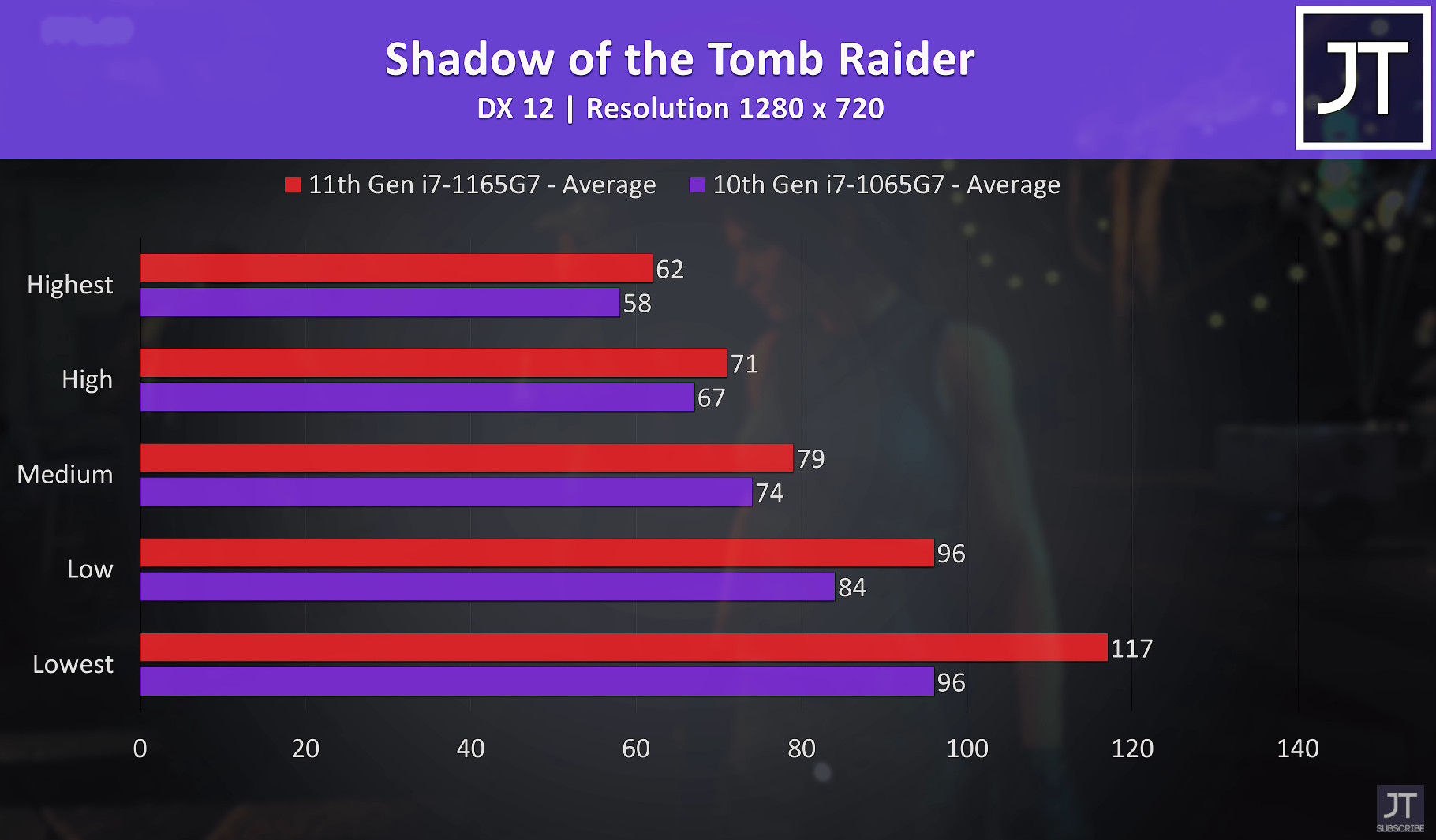 쉐도우 오브 더 툼레이더 낮음 기준으로 보시면 평균 프레임이 117, 96로 i7-1165G7가 i7-1065G7보다 약 18% 우세한 성능을 보여주었습니다.