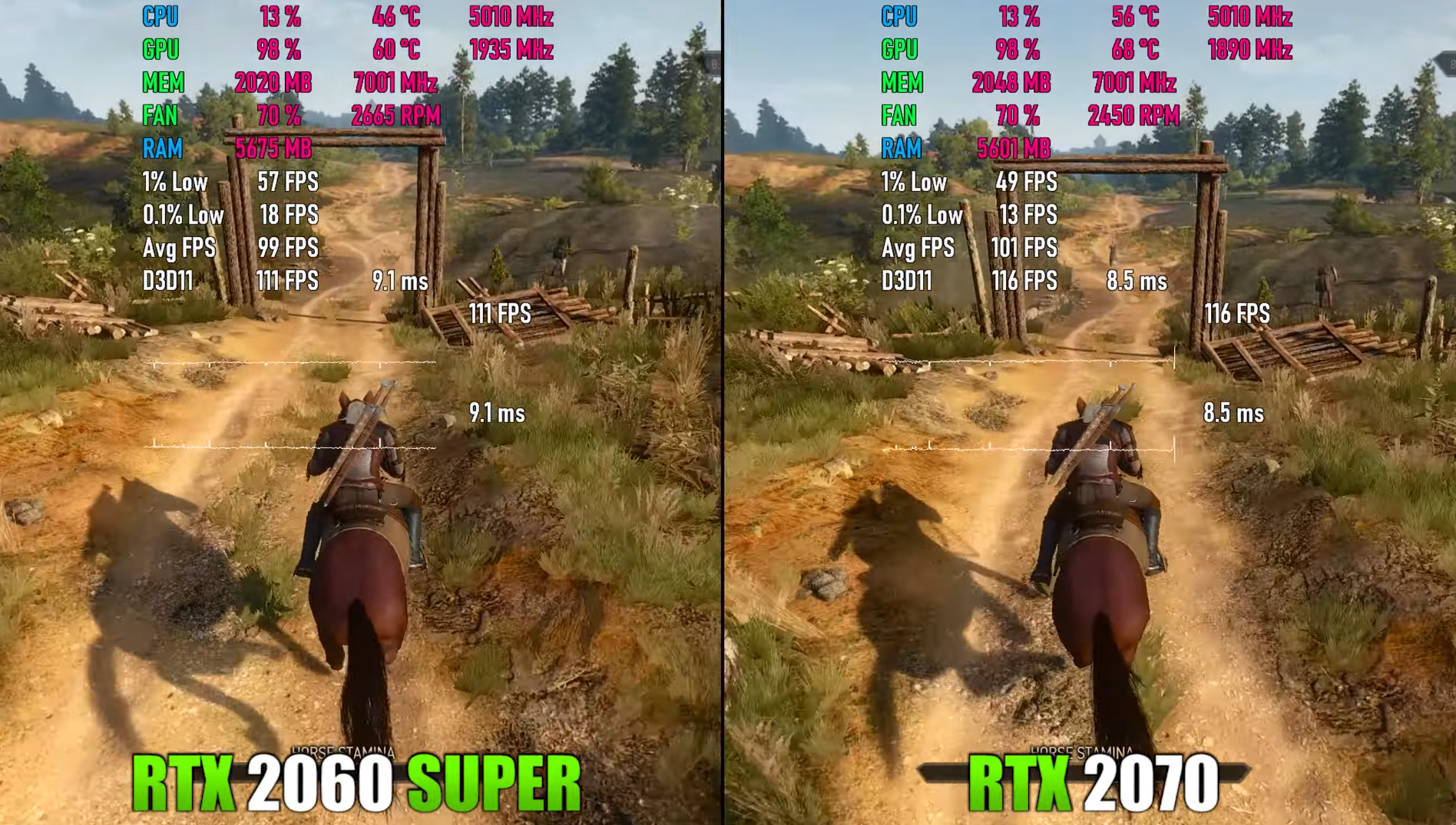 더 위쳐 3 울트라에서 돌렸을 때 각 평균 프레임은 99,101로 거의 RTX2070이 조금 우세하긴 하나 거의 동급의 성능을 보여주었습니다.