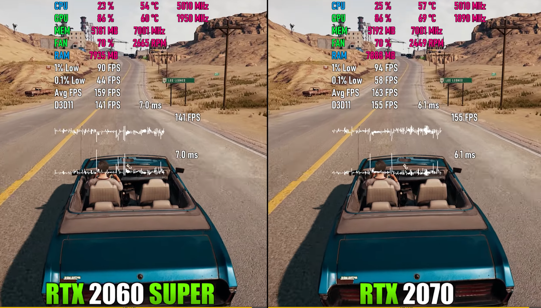 배틀그라운드 울트라에서 돌렸을 때 각 평균 프레임은 159,163로 거의 RTX2070이 조금 우세하긴 하나 이 역시 거의 동급의 성능을 보여주었습니다.