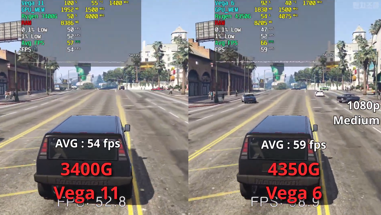 GTA5 중옵으로 FHD에서 플레이 했을 때 각 평균 프레임은 54, 59으로 라이젠 4350G가 라이젠 3400G보다 약 9% 우세한 성능을 보여주었습니다.