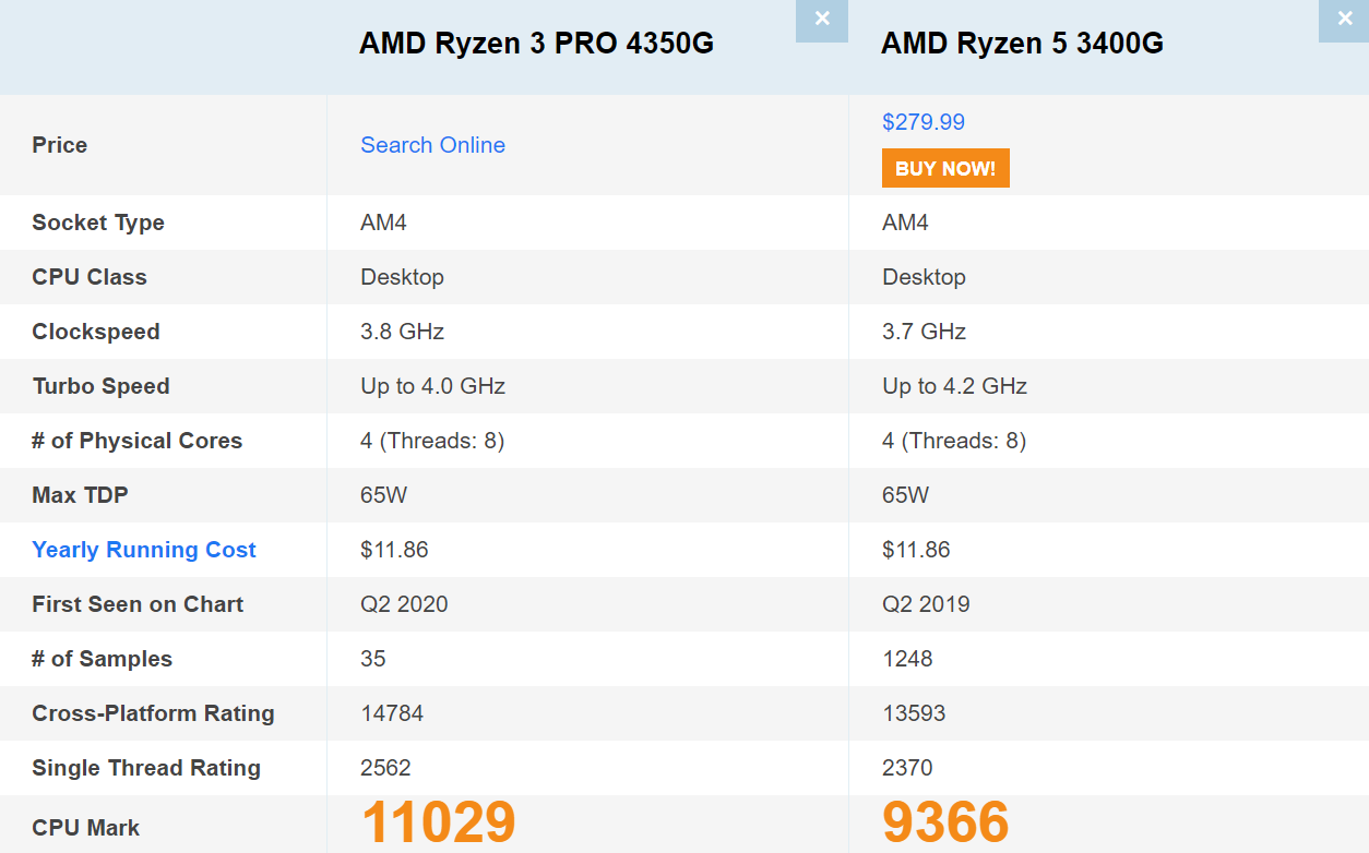 cpubenchmark.com에서 확인한 결과 라이젠 4350G가 라이젠 3400G보다 약 13% 우수한 멀티 성능을 보여주었습니다.