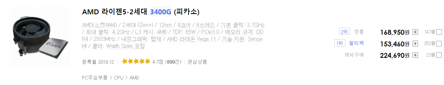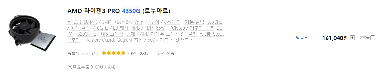 2021. 02. 18 기준으로 라이젠 3400G는 멀티팩 기준으로 153,460원, 라이젠 4350G는 161,040원으로 라이젠 4350G가 8천원 정도 비싸게 형성이 되어있네요.