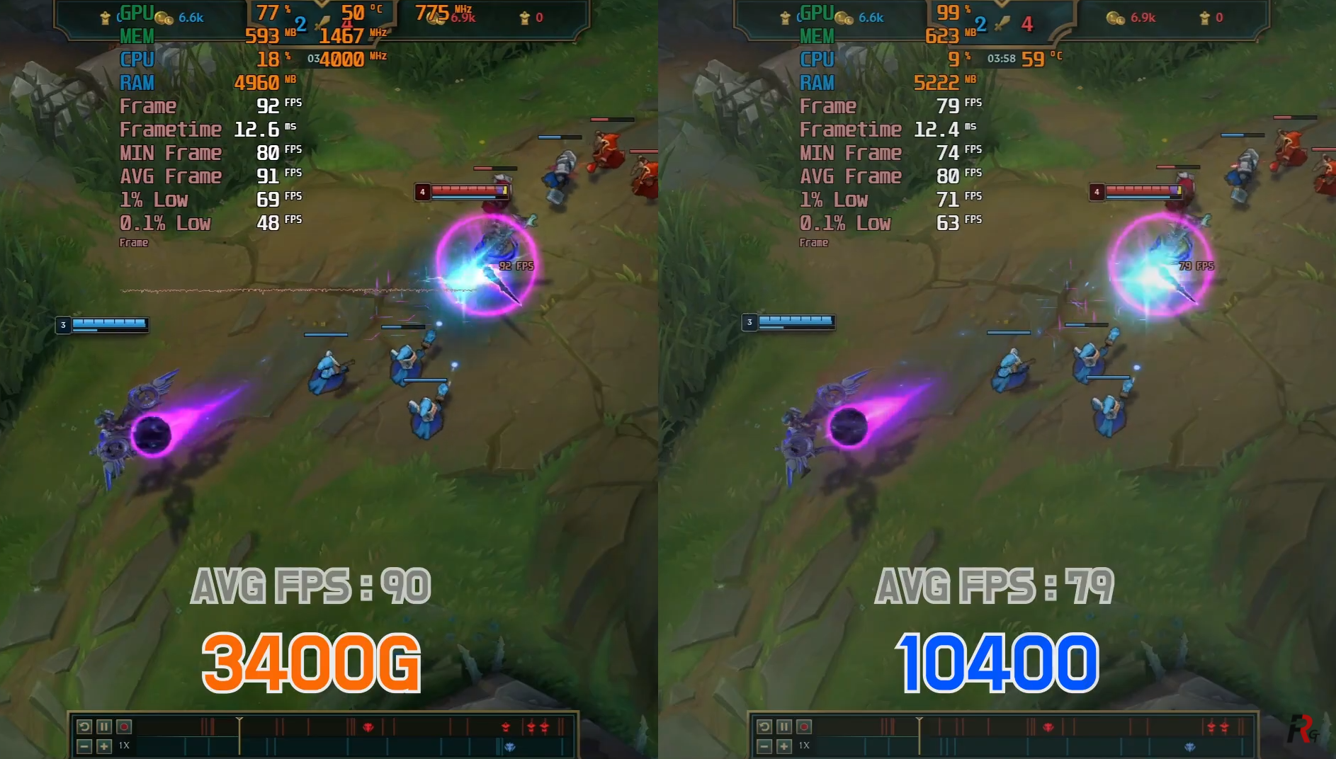 리그 오브 레전드 매우 높음에서 돌렸을 때 각 평균 프레임은 90, 79로 라이젠 3400G가 인텔 i5-10400에 비해 약 13% 우세한 성능을 보여주었습니다.