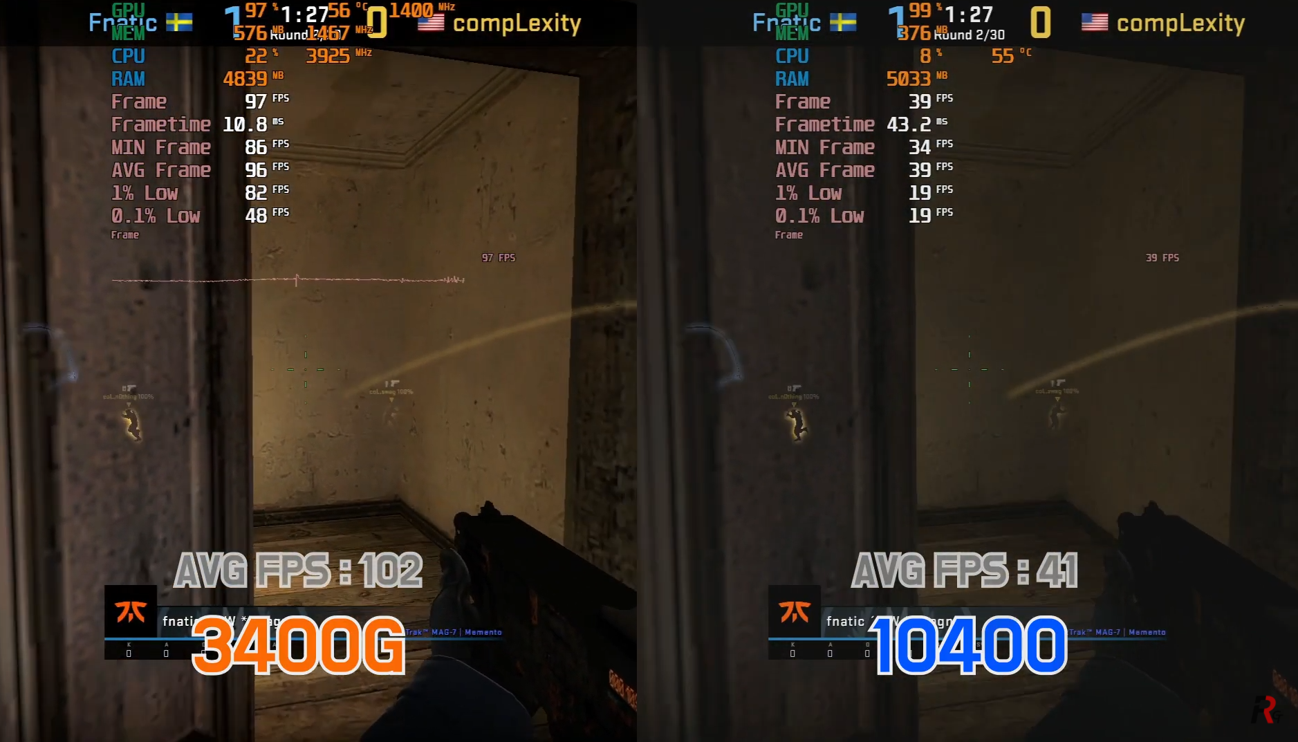 카운터 스트라이크(CS:GO) 매우 낮음에서 돌렸을 때 각 평균 프레임은 102, 41로 라이젠 3400G가 인텔 i5-10400에 비해 약 150% 우세한 성능을 보여주었습니다.