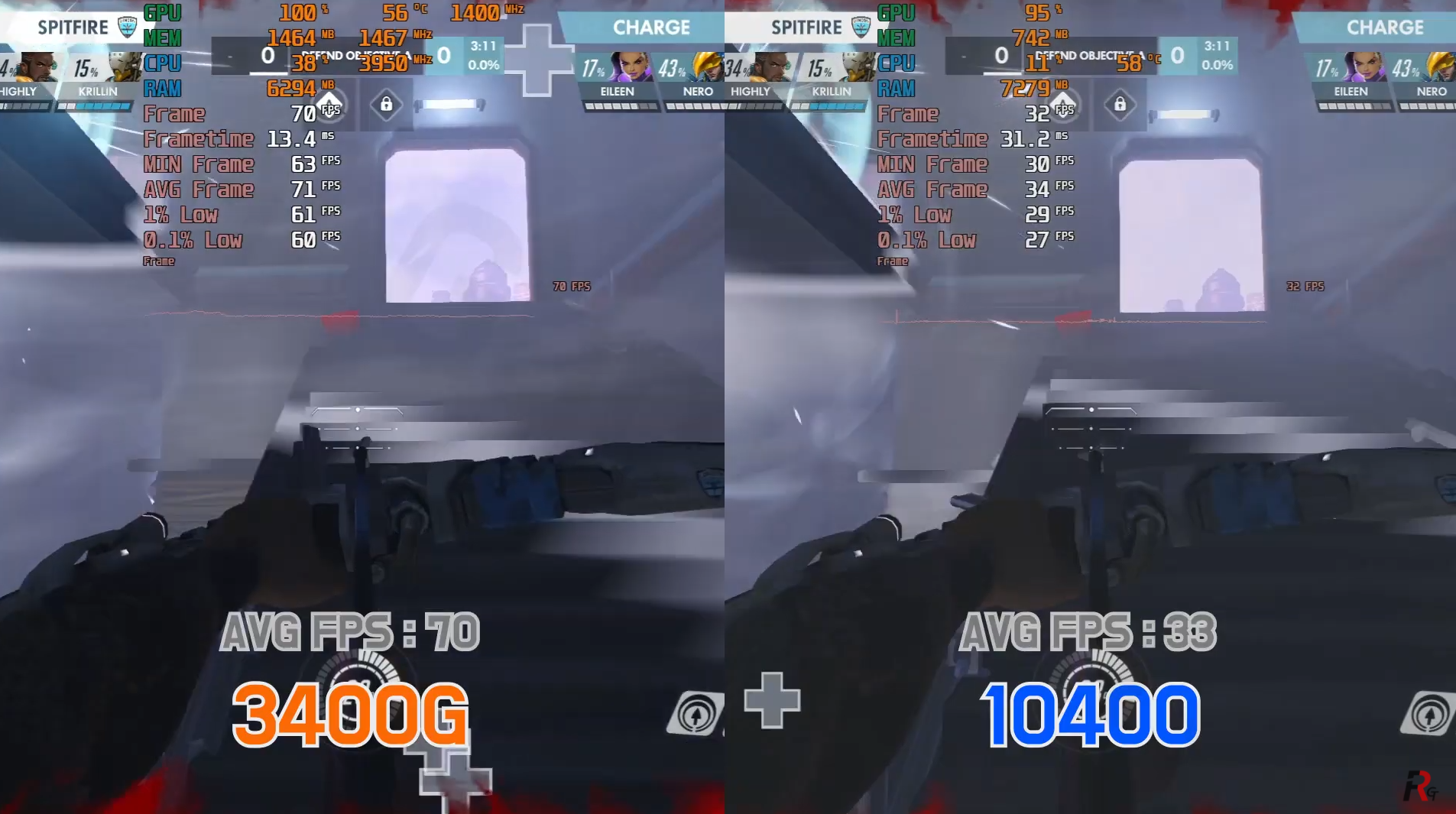 오버워치 낮음에서 돌렸을 때 각 평균 프레임은 70, 33로 라이젠 3400G가 인텔 i5-10400에 비해 약 110% 우세한 성능을 보여주었습니다.