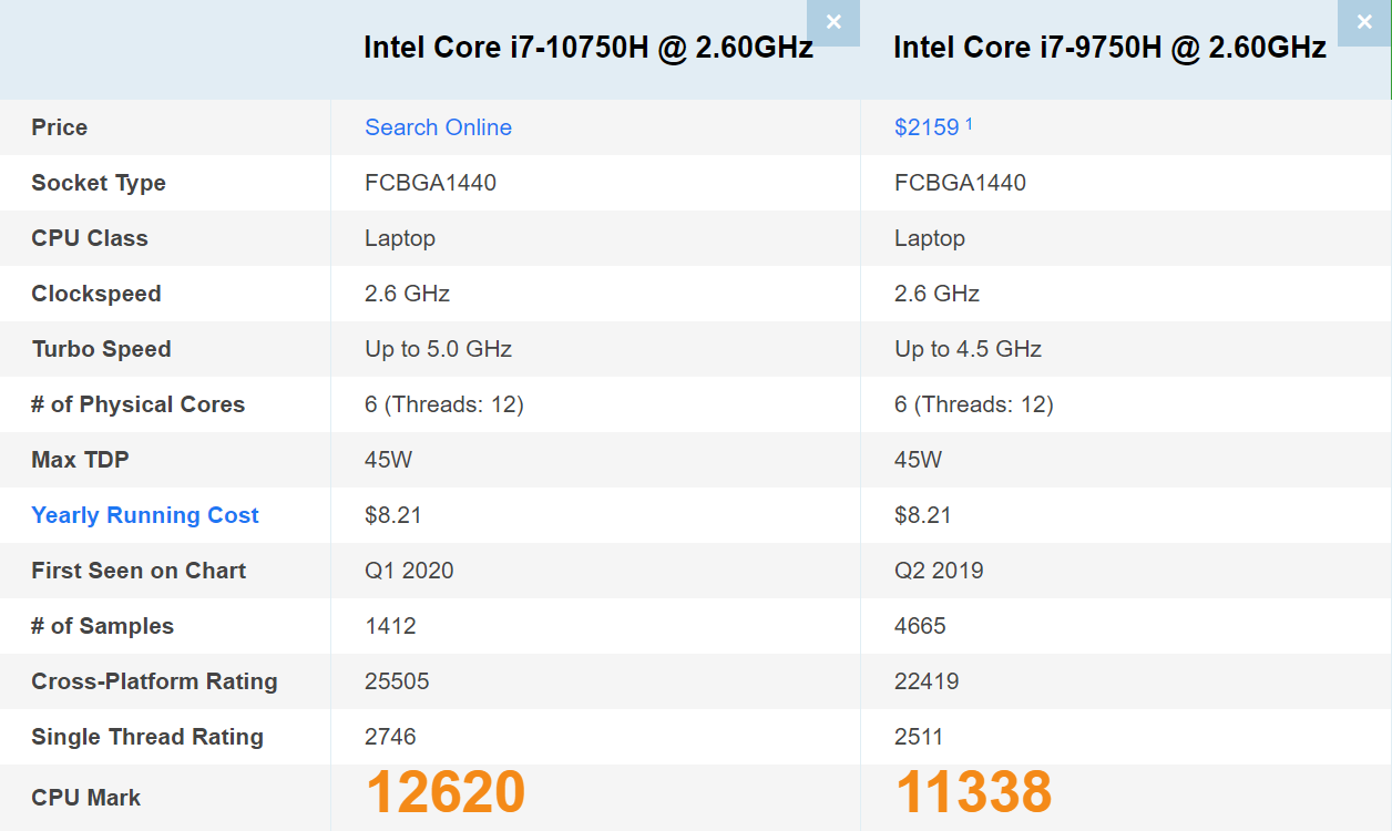cpubenchmark.com사이트에서 확인하면 멀티 성능은 i7-10750H가 i7-9750H에 비해 약 11% 우세한 성능을 보여주고 있습니다. 클럭을 대폭 올린 만큼, 그만큼의 성능 향상은 있는 것으로 보이네요.