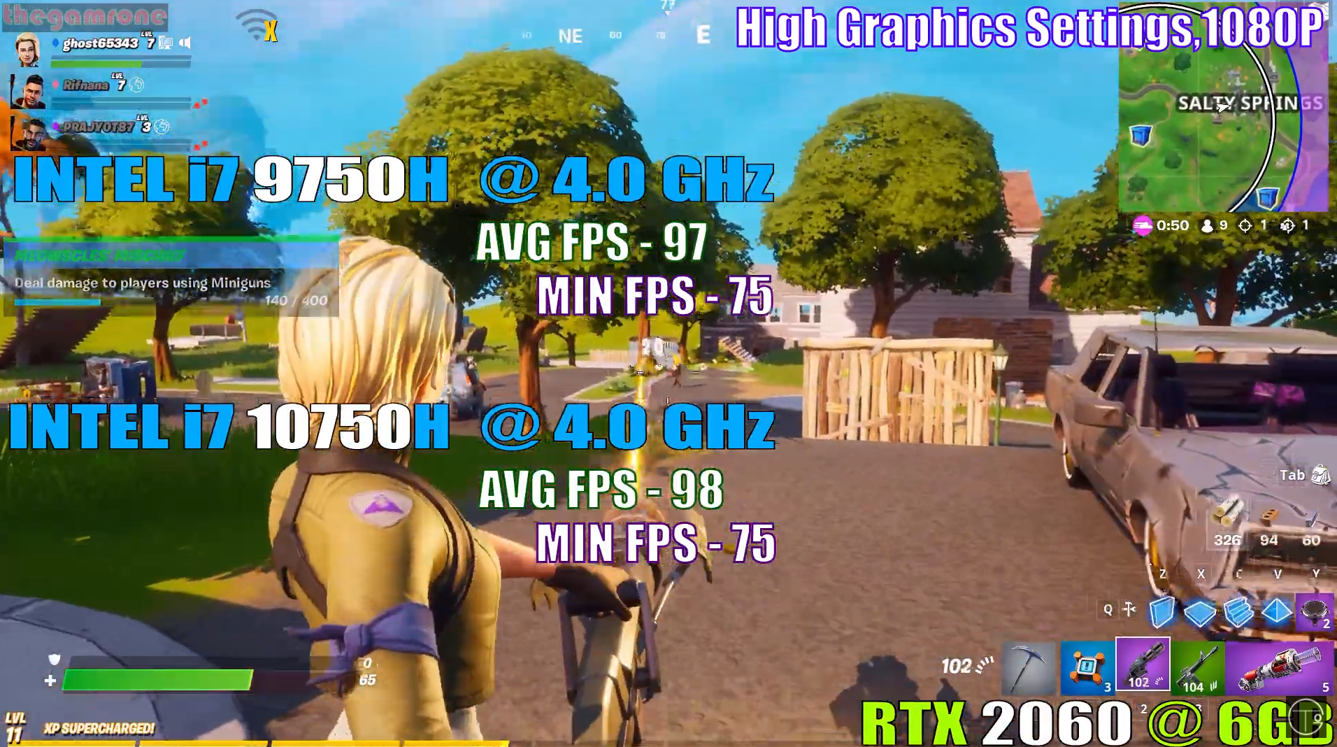 포트 나이트높음에서 실행했을 때 각 평균 프레임은 97, 98로 i7-10750H가 i7-9750H과 거의 동급의 성능을 보여주었습니다.