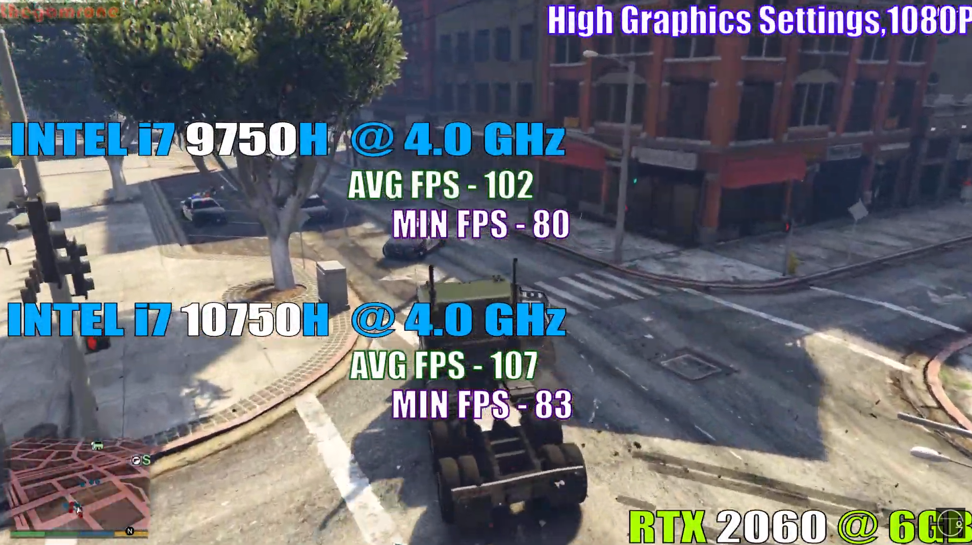 GTA 5 높음에서 실행했을 때 각 평균 프레임은 102, 107로 i7-10750H가 i7-9750H에 비해 약 5% 우세한 성능을 보여주었습니다.