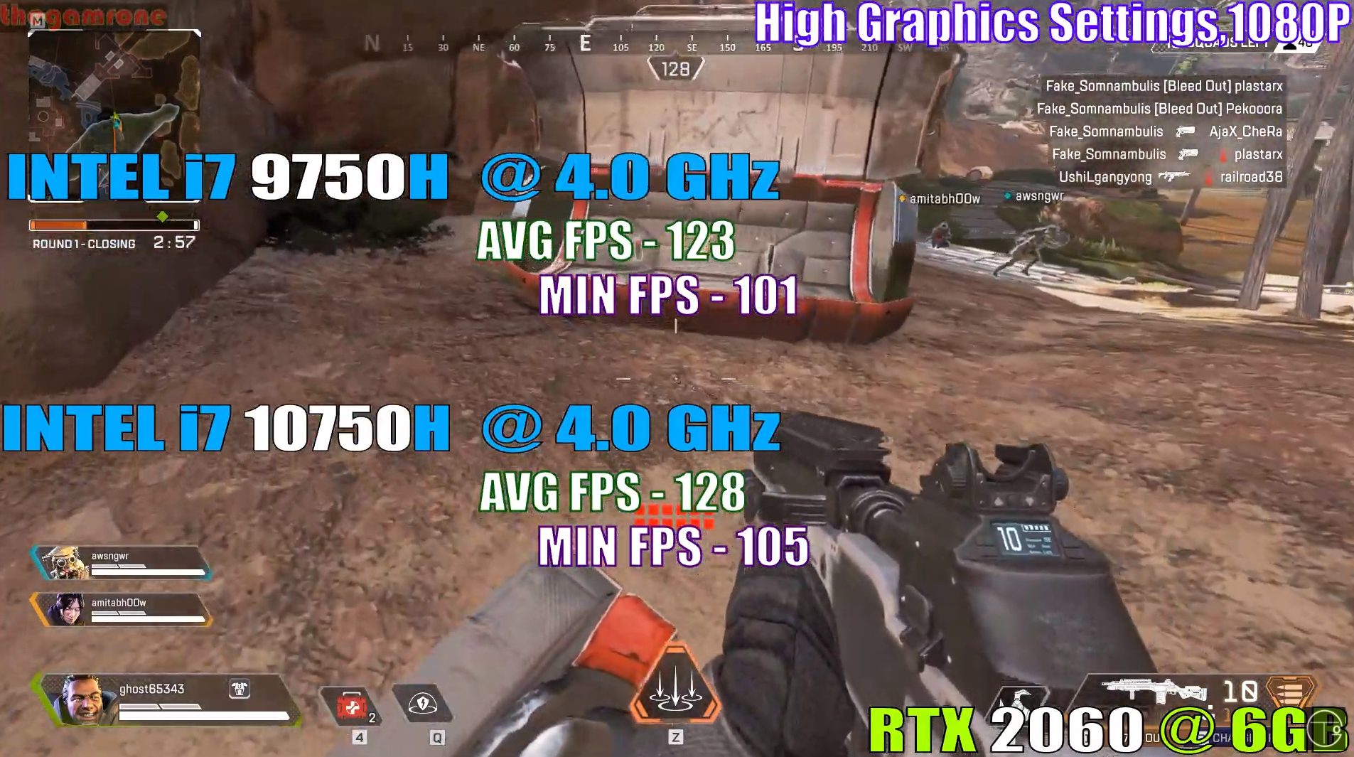 에이펙스 레전드 높음에서 실행했을 때 각 평균 프레임은 123, 128로 i7-10750H가 i7-9750H에 비해 약 5% 우세한 성능을 보여주었습니다.