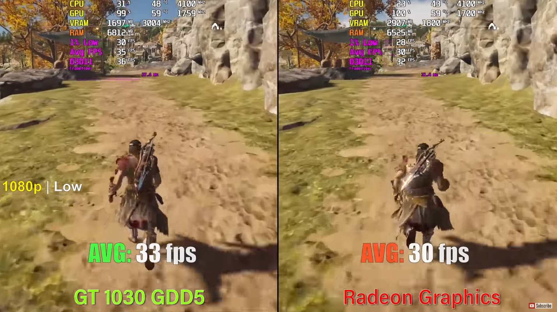어쌔신 크리드 오디세이 낮음에서 돌렸을 때 각 평균 프레임은 33, 30으로 GT1030이 4350G(Vega 6)에 대비하여 약간 우세한 성능을 보이기는 했으나 거의 동급의 성능을 보여주었습니다.