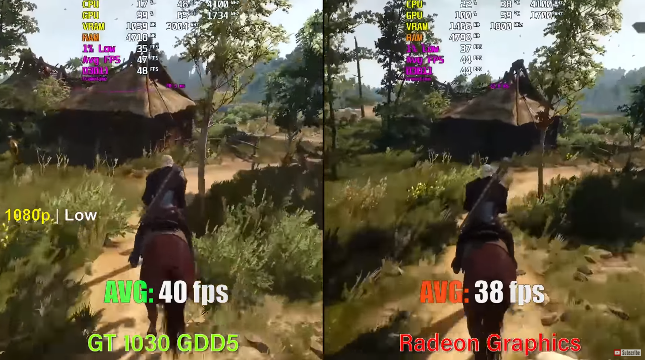 더 위쳐 3 낮음에서 돌렸을 때 각 평균 프레임은 40, 38로 GT1030이 4350G(Vega 6)에 대비하여 약간 우세한 성능을 보이기는 했으나 거의 동급의 성능을 보여주었습니다.