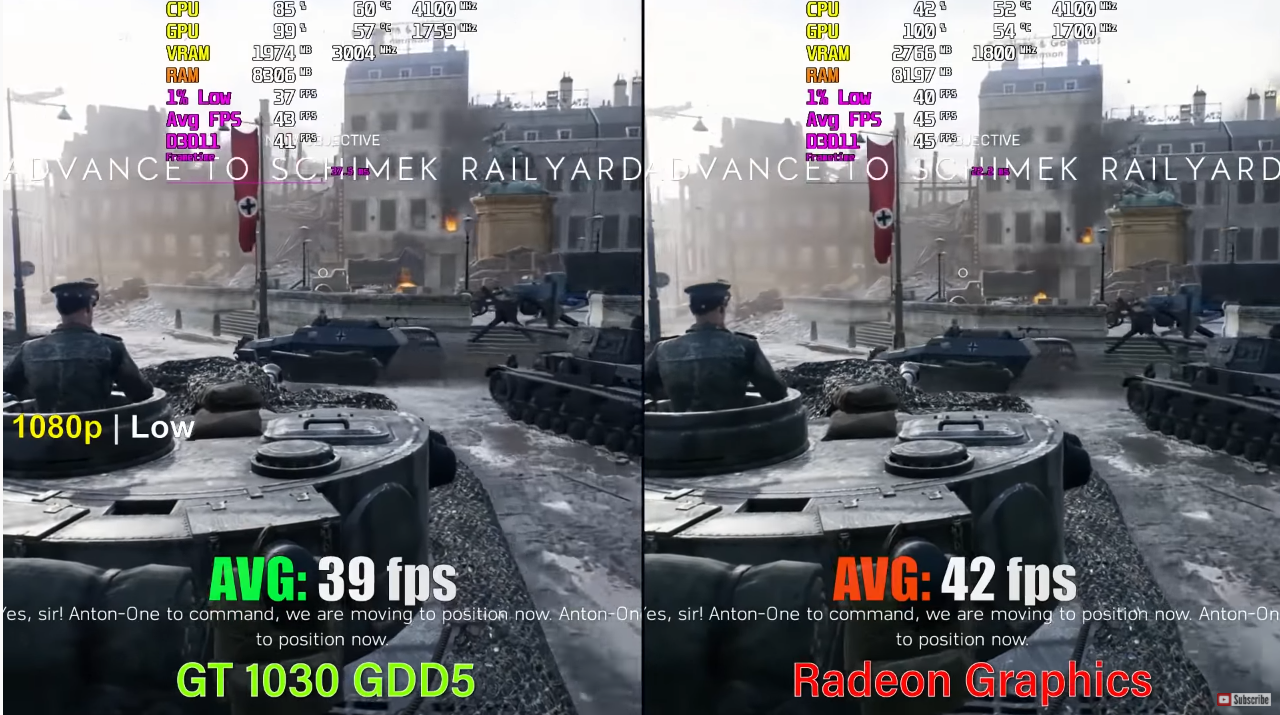 배틀필드 5 낮음에서 돌렸을 때 각 평균 프레임은 39, 42로 4350G(Vega 6)이 GT1030에 대비하여 약간 우세한 성능을 보이기는 했으나 거의 동급의 성능을 보여주었습니다.
