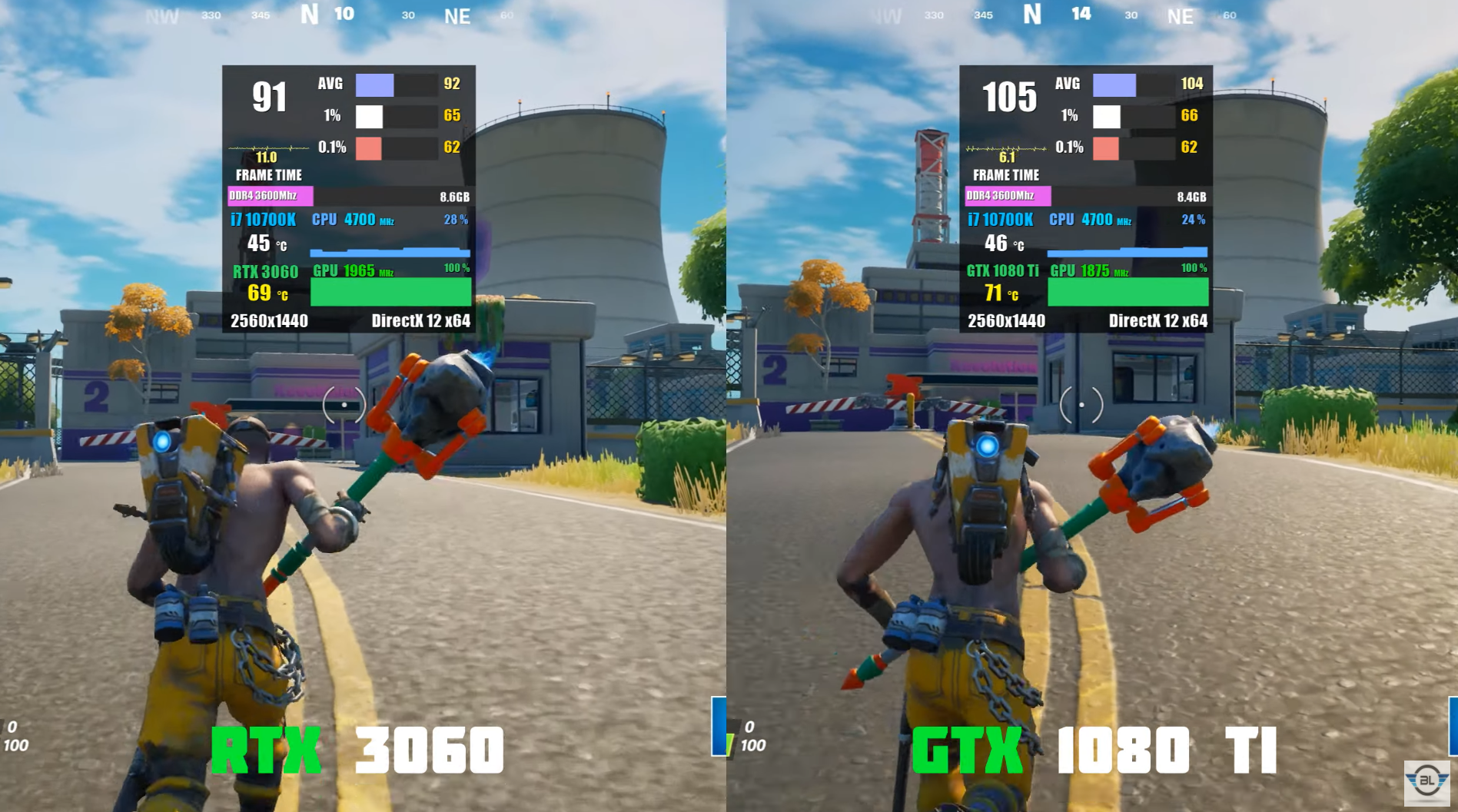 QHD 포트 나이트 최상에서 돌렸을 때 각 평균 프레임은 92, 104로 GTX1080 Ti가 RTX3060에 비해 약 13% 우세한 성능을 보여주었습니다.
