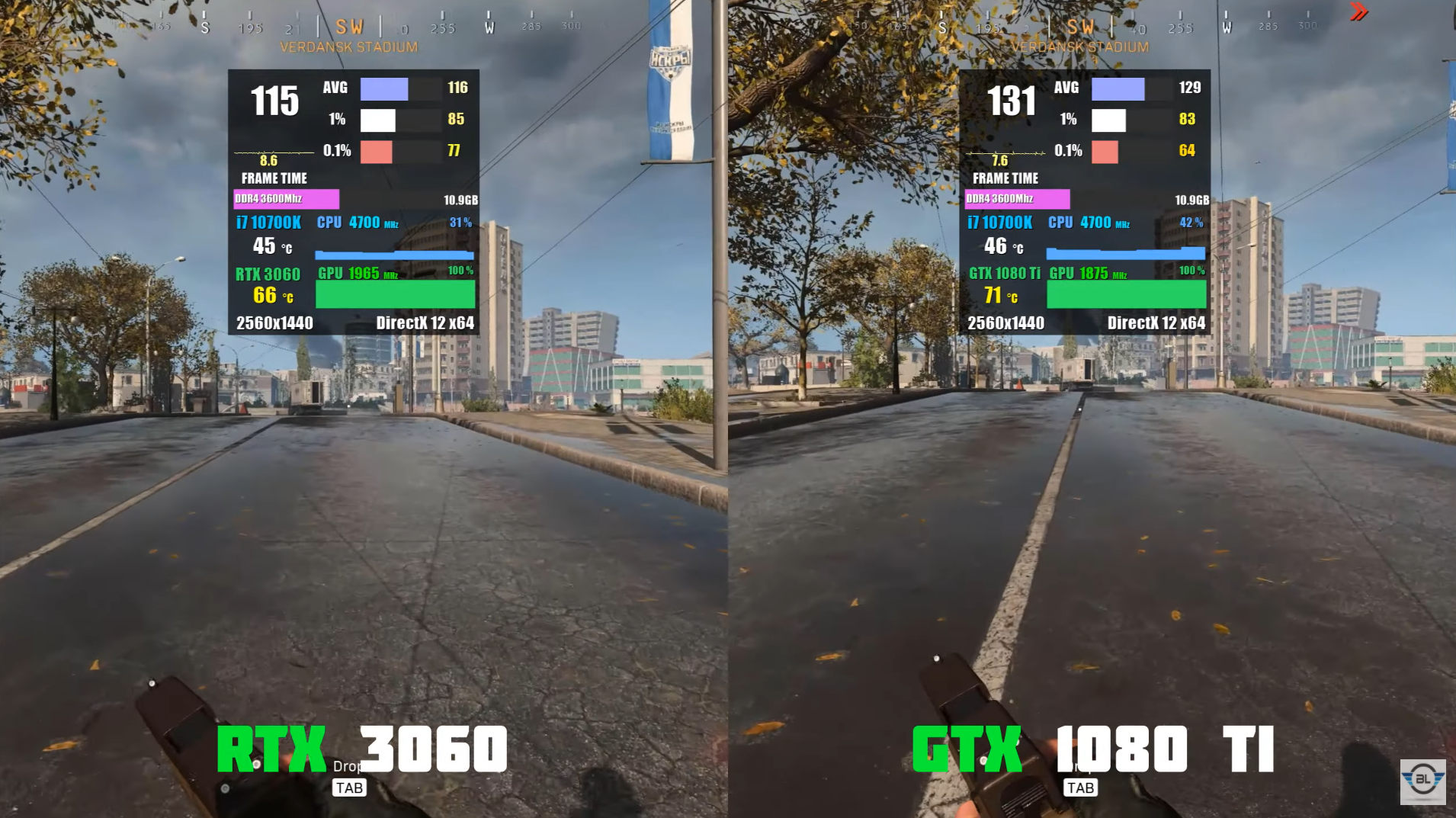 QHD 콜오브 듀티 워존 울트라에서 돌렸을 때 각 평균 프레임은 116, 129로 GTX1080 Ti가 RTX3060에 비해 약 11% 우세한 성능을 보여주었습니다.