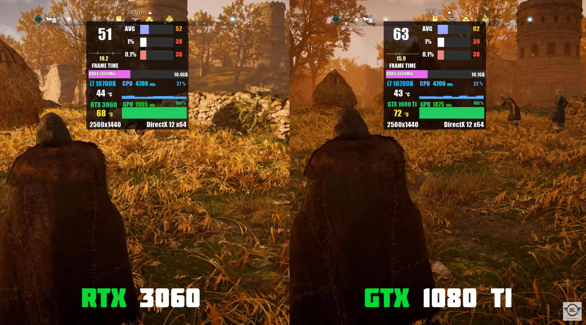 QHD 어크 발할라 울트라에서 돌렸을 때 각 평균 프레임은 52, 62로 GTX1080 Ti가 RTX3060에 비해 약 20% 우세한 성능을 보여주었습니다. 어크 발할라 울트라에서 RTX3060은 평균 프레임이 살짝 아쉽지만 GTX1080 Ti는 원활한 플레이가 가능할 것으로 보이네요.