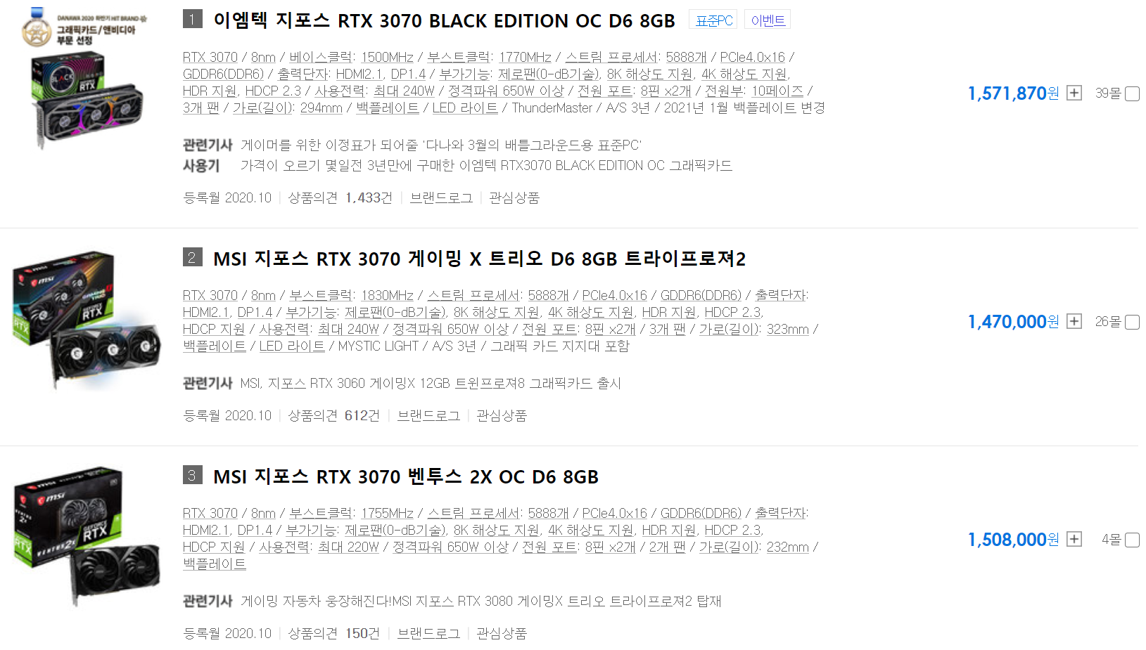 둘의 출시가가 30% 차이 나는 만큼 딱 가격 만큼의 성능 차이가 나는 것 같습니다. 저 출시가 대로라면 각각 약 38, 57만 원이지만 현재는 앞서 언급했듯이, 비트코인의 떡상으로 인하여 덩달아 그래픽카드의 가격도 많이 올라가 있는 상태입니다.