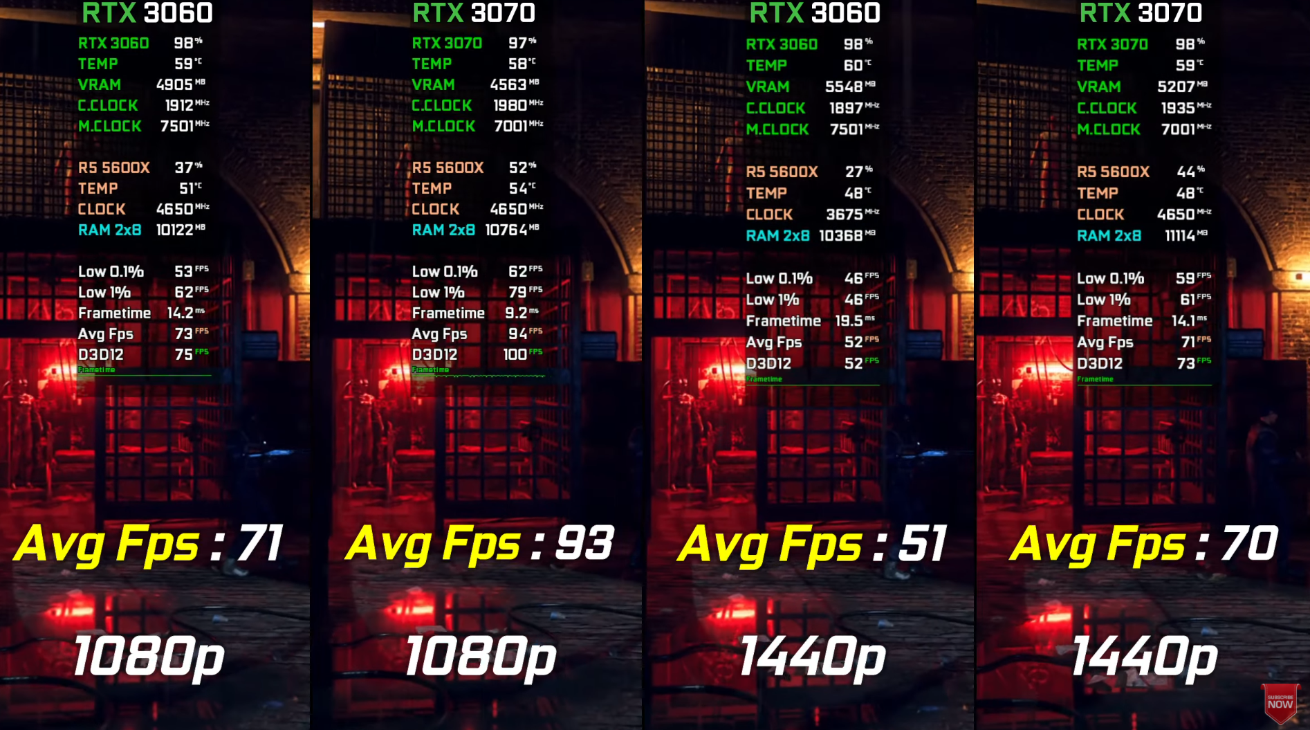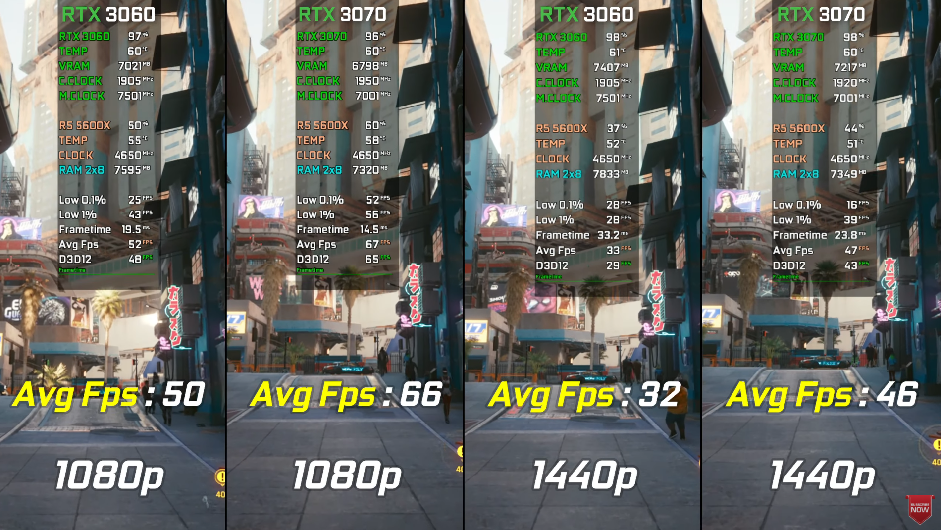 싸이버 펑크 2077 울트라에서 돌렸을 때 FHD 기준으로 각 평균 프레임은 50, 66로 RTX3070이 RTX3070 대비 약 32% 우세한 성능을 보여주었습니다.