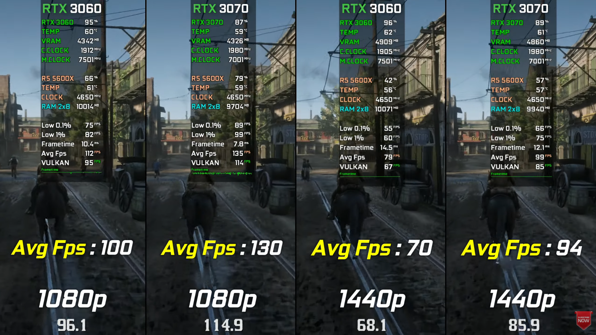 레드 데드 리뎀션 2 울트라에서 돌렸을 때 FHD 기준으로 각 평균 프레임은 100, 130로 RTX3070이 RTX3070 대비 약 30% 우세한 성능을 보여주었습니다.