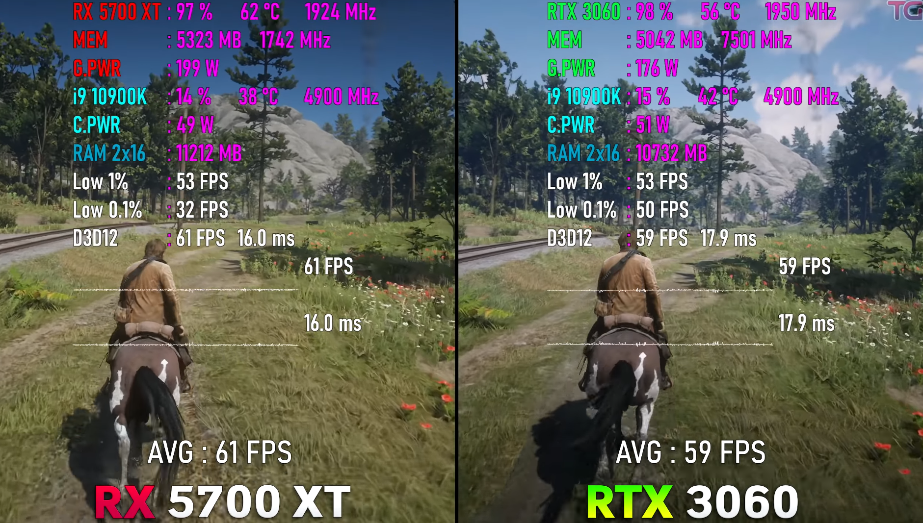 레드 데드 리뎀션 2 울트라에서 돌렸을 때 QHD 기준으로 각 평균 프레임은 61, 59로 동급의 성능을 보여주었습니다.