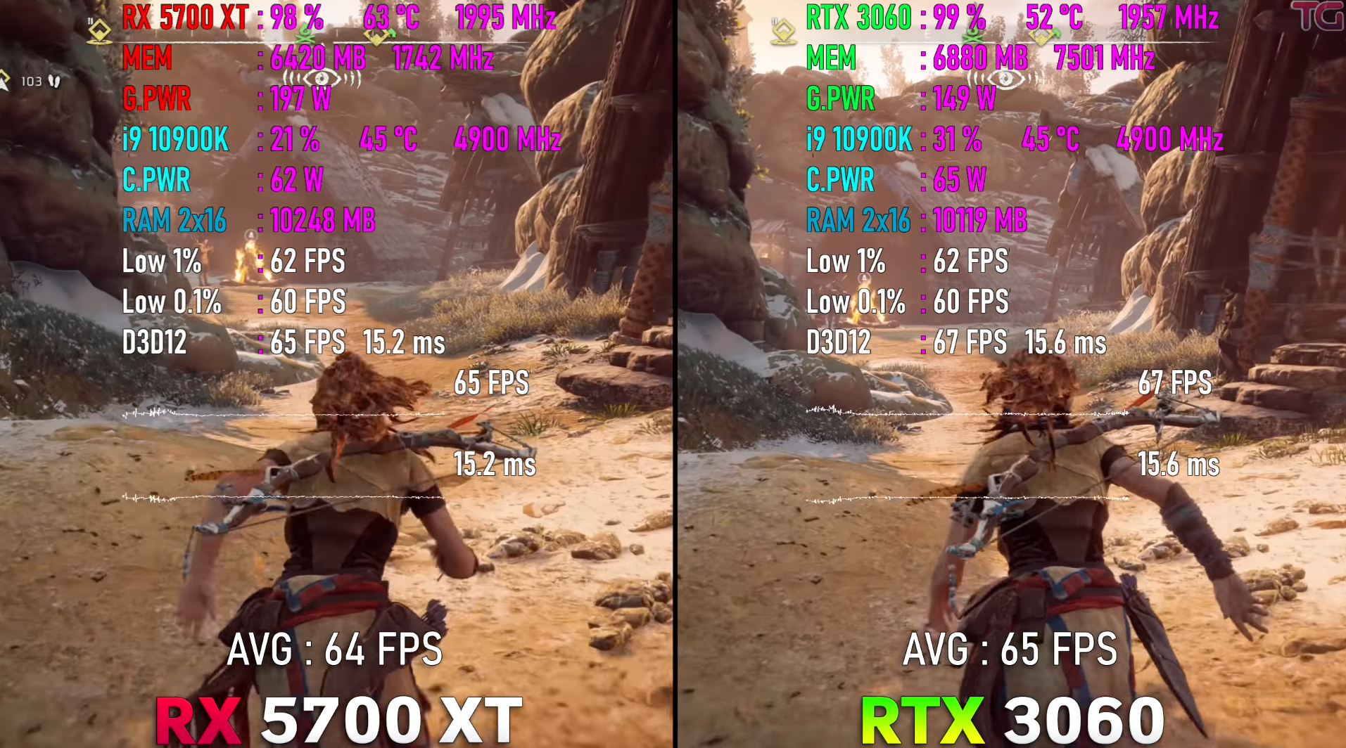 호라이즈 제로 던 울트라에서 돌렸을 때 QHD 기준으로 각 평균 프레임은 64, 65로 RTX3060과 RX5700xt은 서로 동급의 성능을 보여주었습니다. 게임마다 편차가 있지만 종합적으로 보았을 때 RTX3060과 RX5700xt은 거의 비슷한 성능을 내준다고 보면 될 듯 하네요.