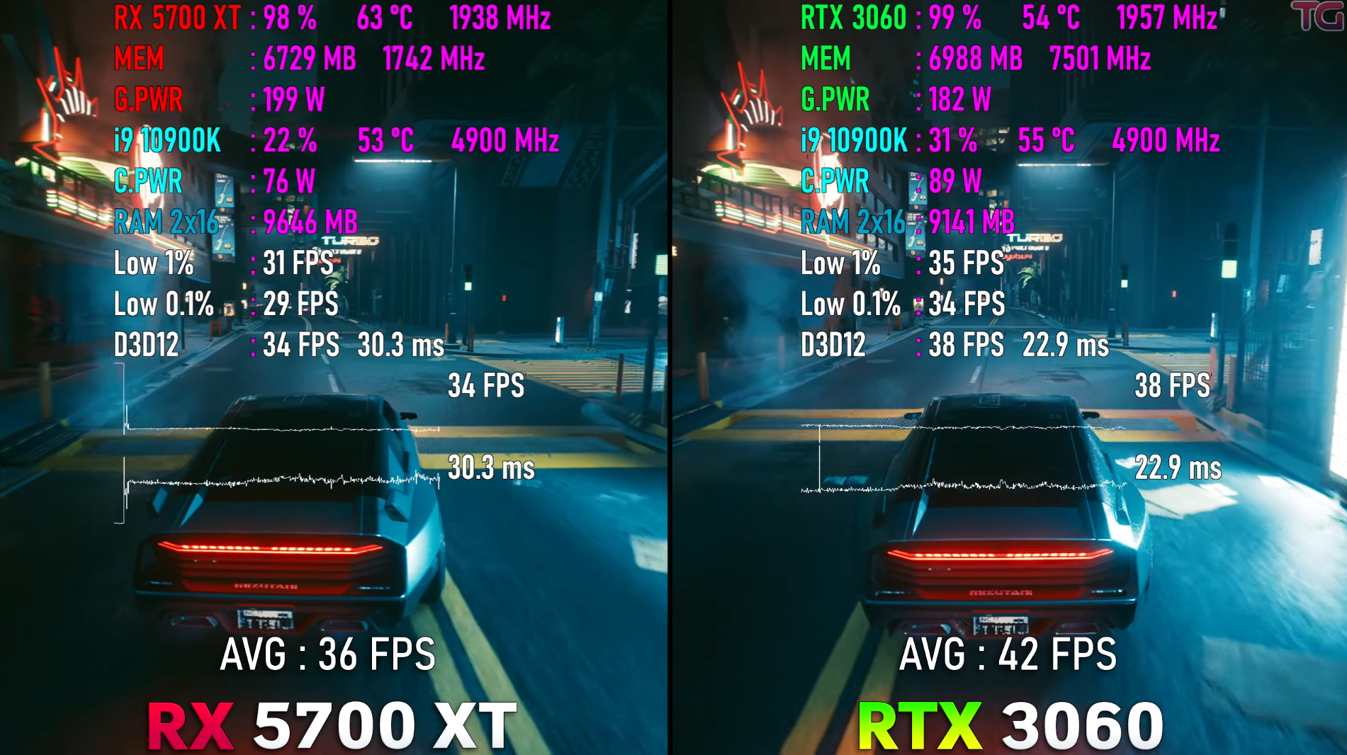 싸이버펑크 2077 울트라에서 돌렸을 때 QHD 기준으로 각 평균 프레임은 36, 42로 RTX3060이 RX5700xt보다 약 16% 우세한 성능을 보여주었습니다.