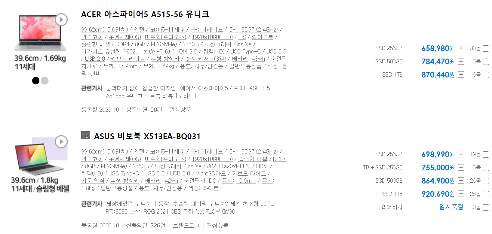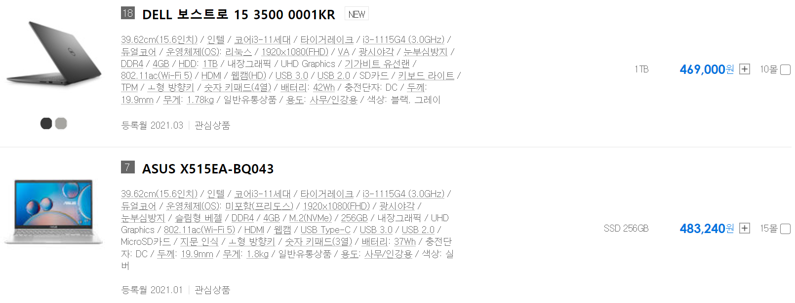 15.6인치 노트북 기준으로 인텔 i3-1115G4의 가격은 40만원 중반, 인텔 i5-1135G7의 가격은 60만원 중반으로 약 20만원 정도 차이가 나는 것을 알 수 있습니다.