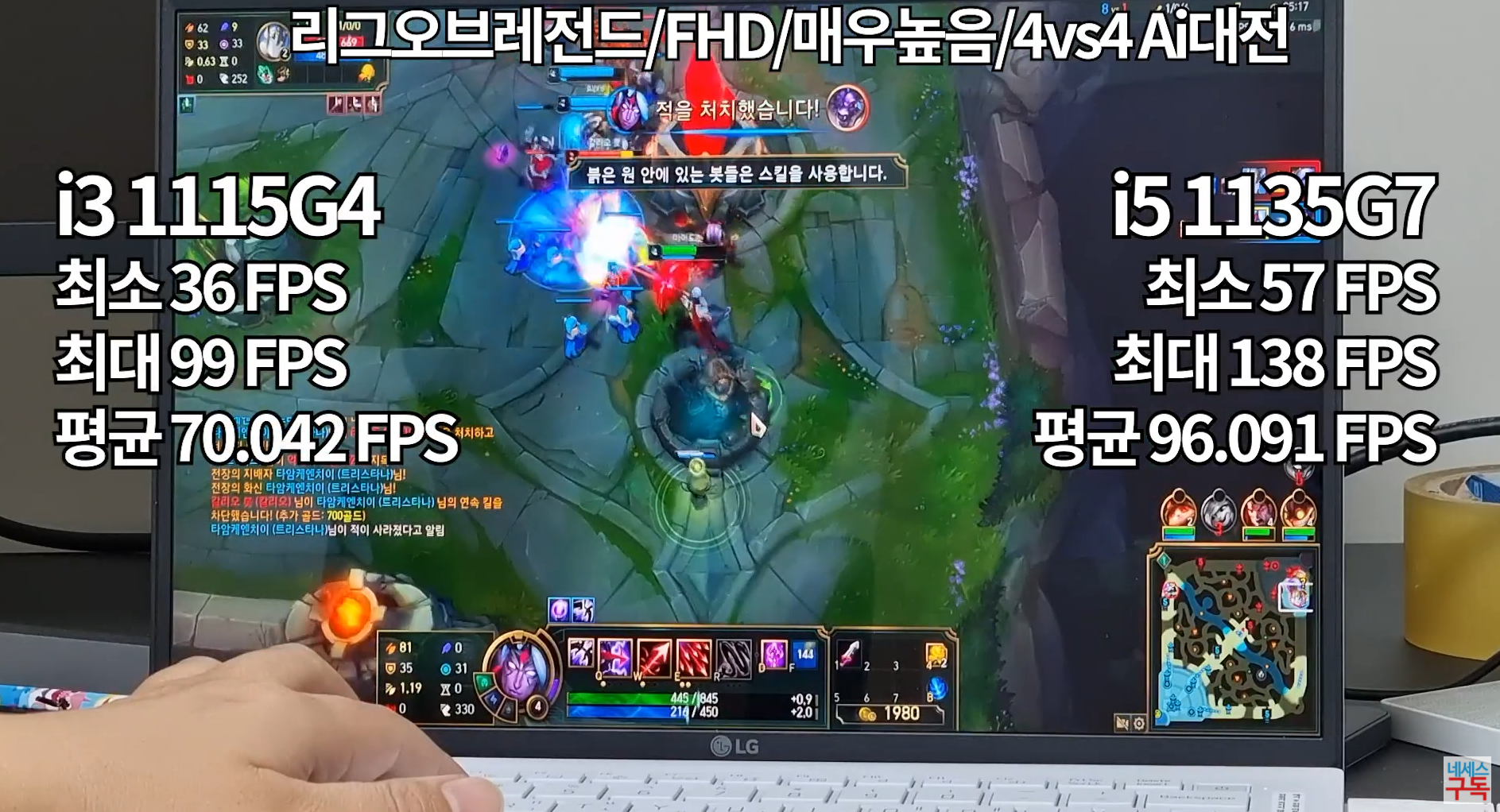리그 오브 레전드 매우 높음에서 각 평균 프레임은 70, 96으로 인텔 i5-1135G7이 i3-1115G4에 비해 약 37% 우세한 성능을 보여주었습니다.
