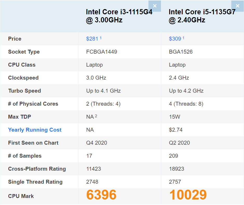 cpubenchmark 사이트에서 나온 결과 각 점수는 6396, 10029점으로 인텔 i5-1135G7이 인텔 i3-1115G4에 비해 약 56% 우세한 CPU 성능을 지닌 것으로 확인됩니다.
