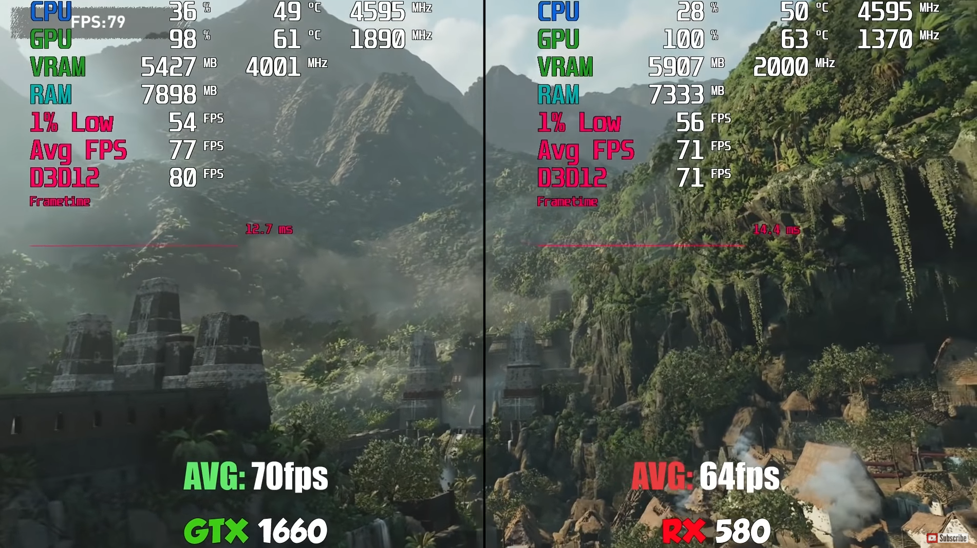 쉐도우 오브 더 툼레이더 울트라에서 돌렸을 때 FHD 기준으로 각 평균 프레임은 70, 64로 GTX1660이 RX580에 대비하여 약 10% 우세한 성능을 보여주었습니다.