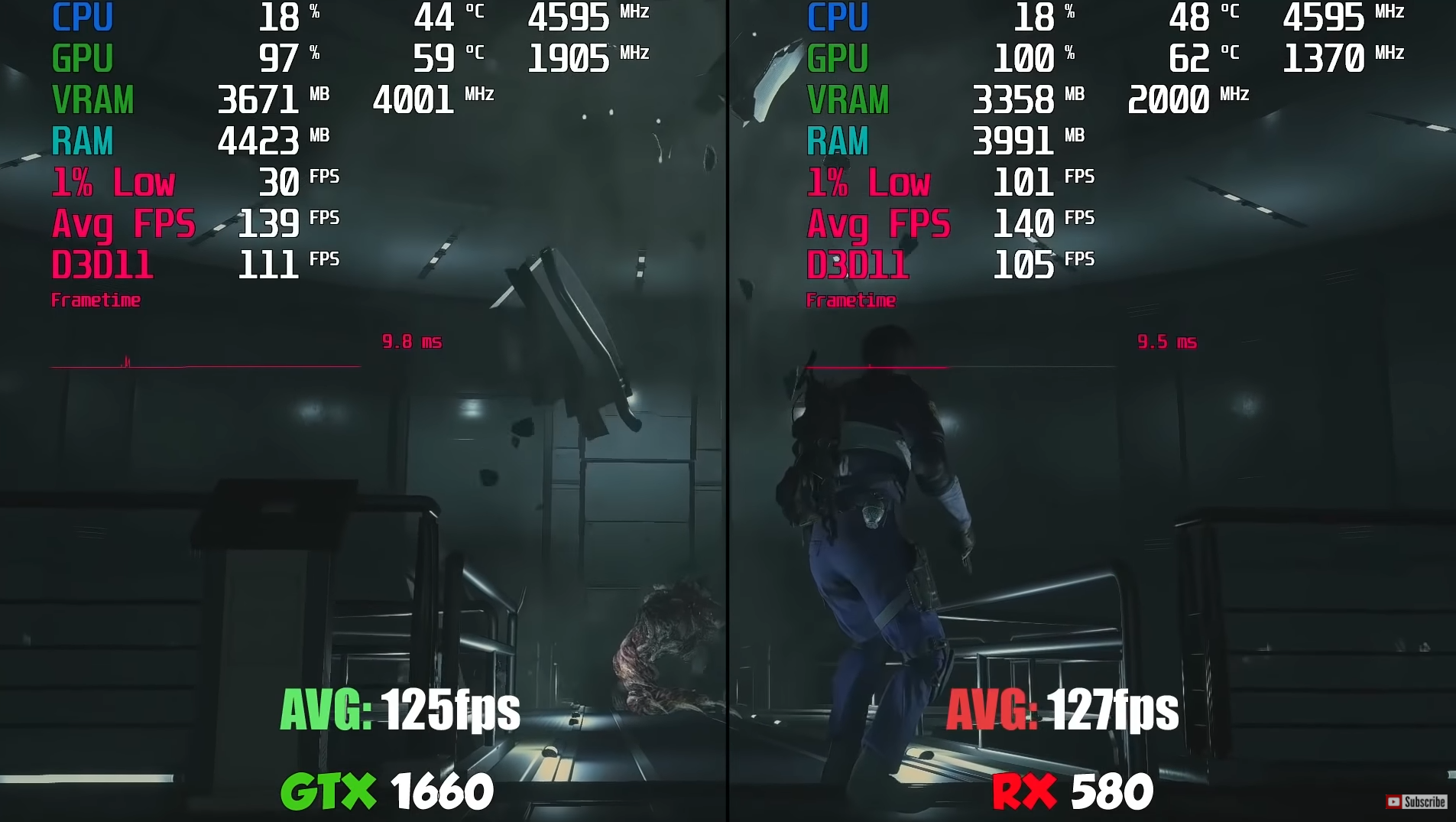 레지던트 이블 2 리메이크 높음에서 돌렸을 때 FHD 기준으로 각 평균 프레임은 125, 127로 서로 동급의 성능을 보여주었습니다. 게임마다 편차가 있지만 종합적으로 보았을 때 GTX1660이 RX580에 대비하여 약 13% 우세한 게임 성능을 가지고 있다고 볼 수 있겠네요.