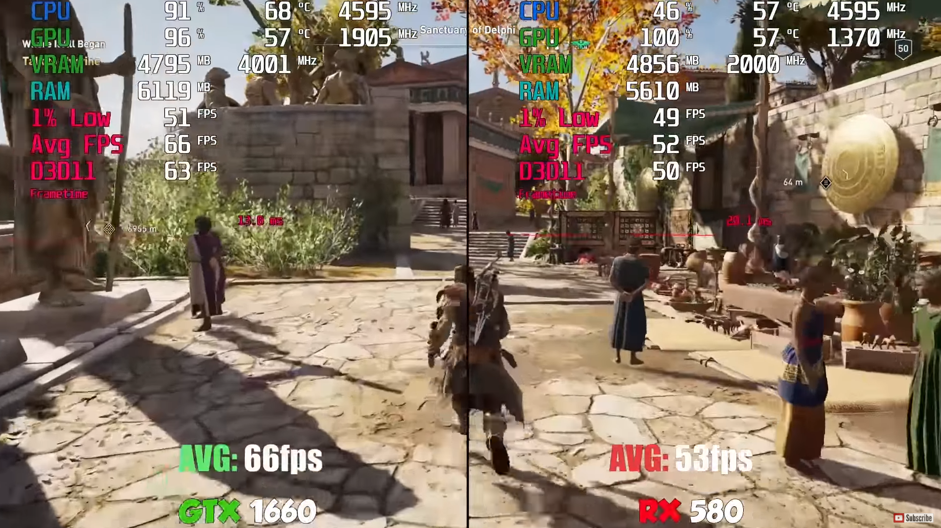 어쌔신 크리드 오디세이 매우 높음에서 돌렸을 때 FHD 기준으로 각 평균 프레임은 66, 53으로 GTX1660이 RX580에 대비하여 약 24% 우세한 성능을 보여주었습니다.