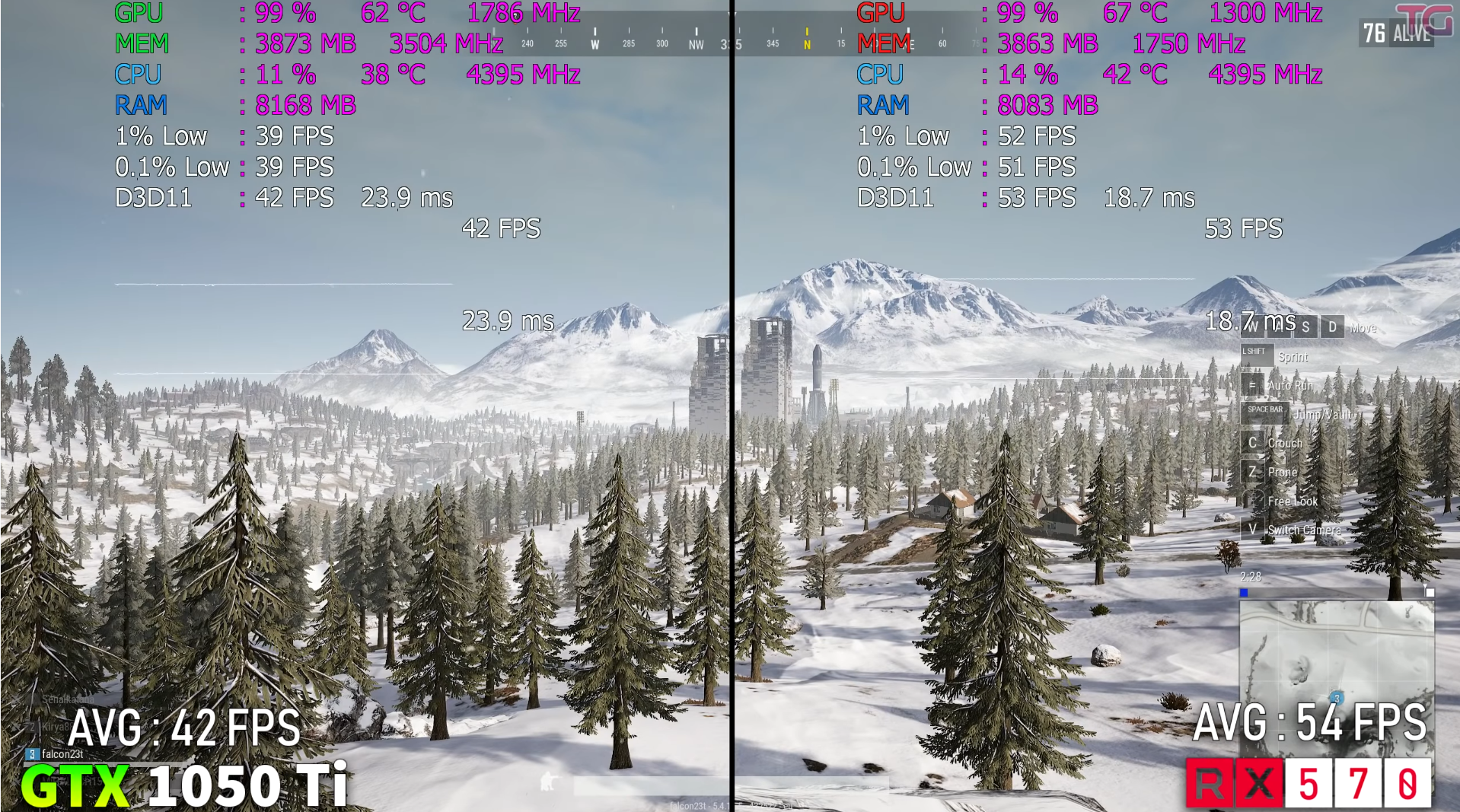 배틀그라운드 울트라에서 돌렸을 때 FHD 기준으로 각 평균 프레임은 42, 54로 RX570이 GTX1050 Ti에 대비하여 약 28% 우세한 성능을 보여주었습니다.