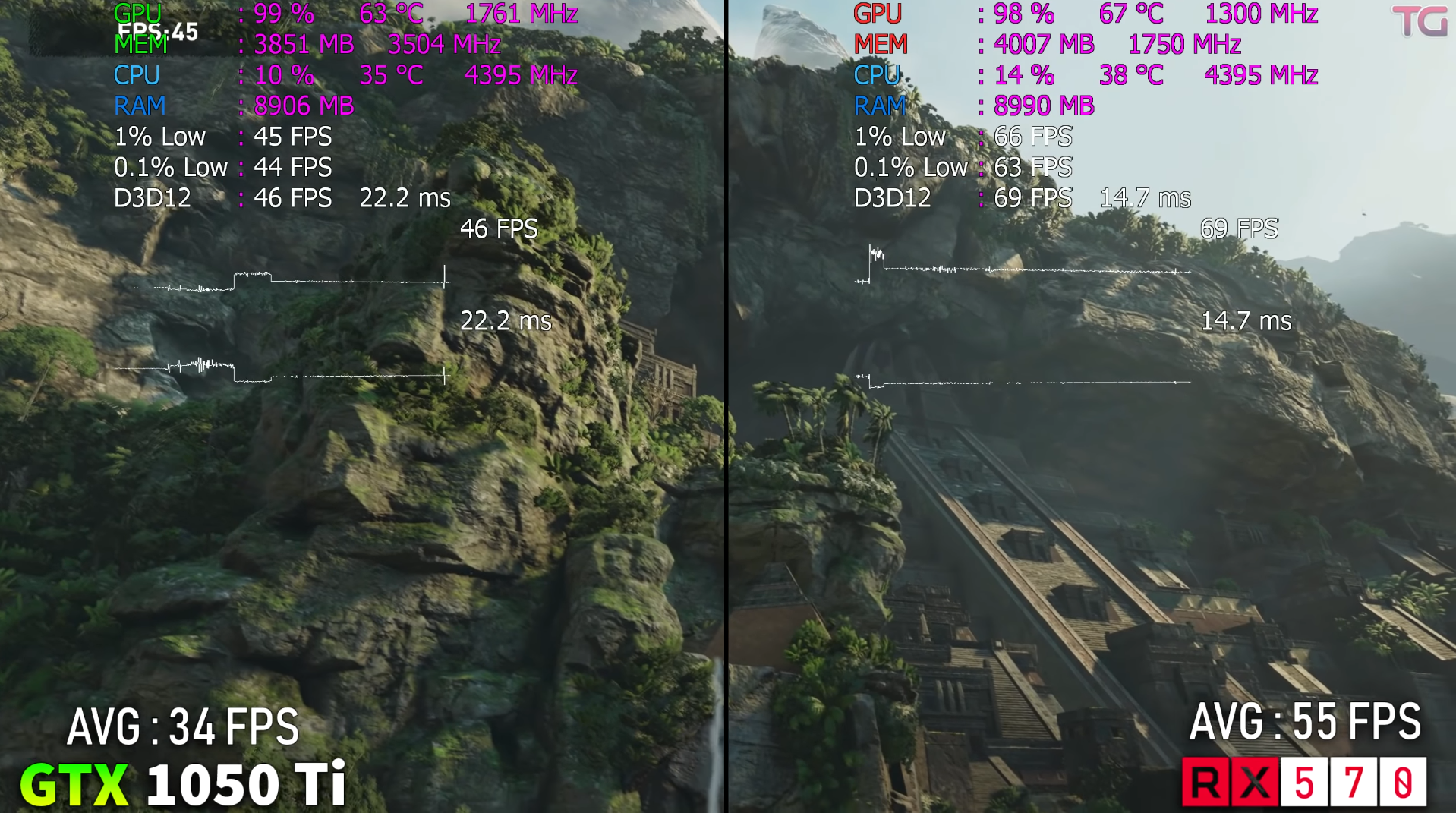 쉐도우 오브 더 툼레이더 매우 높음에서 돌렸을 때 FHD 기준으로 각 평균 프레임은 34, 55로 RX570이 GTX1050 Ti에 대비하여 약 61% 우세한 성능을 보여주었습니다.