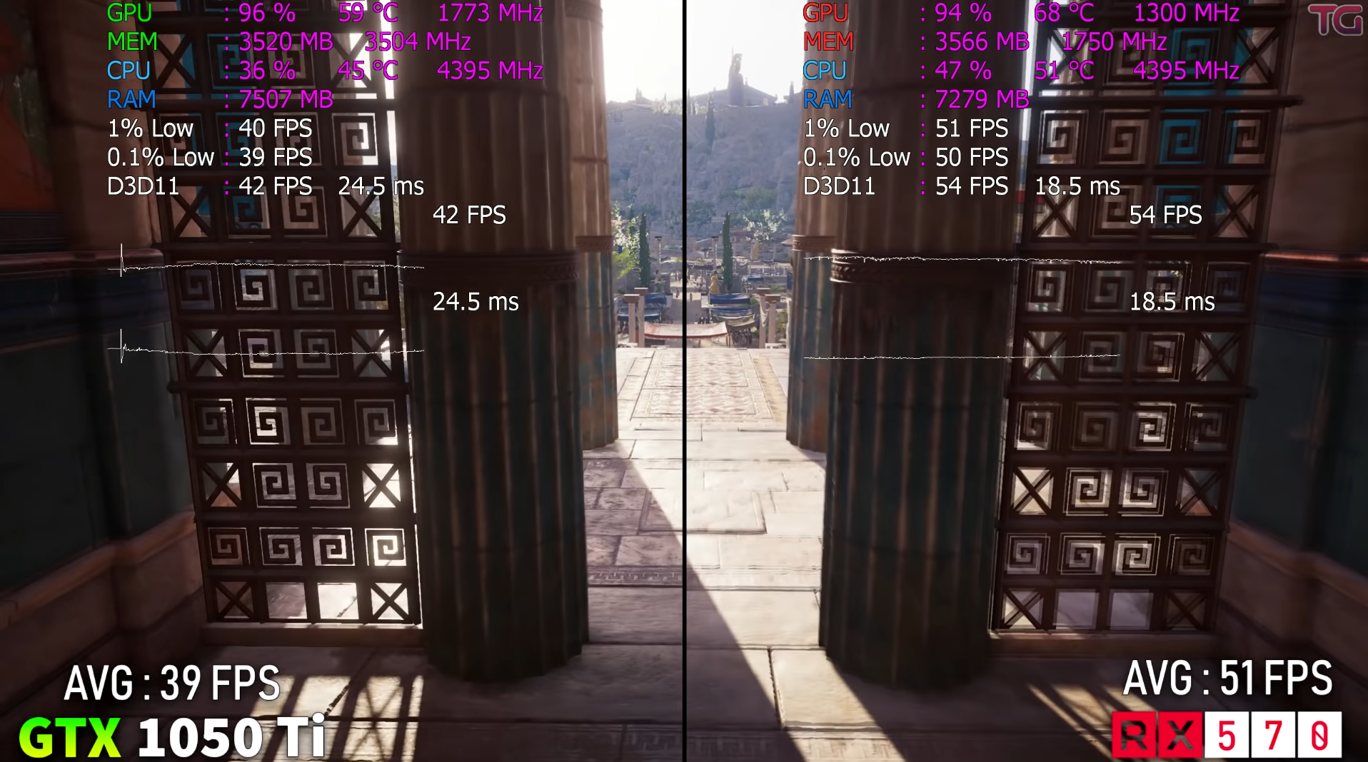 어쌔신 크리드 오디세이 높음에서 돌렸을 때 FHD 기준으로 각 평균 프레임은 39, 51로 RX570이 GTX1050 Ti에 대비하여 약 30% 우세한 성능을 보여주었습니다. 게임마다 편차가 있지만 종합적으로 보았을 때 RX570이 GTX1050 Ti에 대비하여 약 46% 우세한 게임 성능을 가지고 있다고 볼 수 있겠네요.