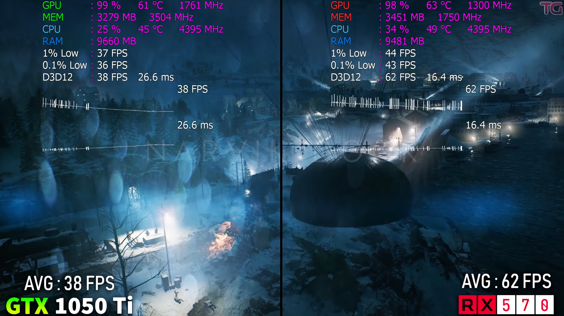 배틀필드 5 높음에서 돌렸을 때 FHD 기준으로 각 평균 프레임은 38, 62로 RX570이 GTX1050 Ti에 대비하여 약 63% 우세한 성능을 보여주었습니다.