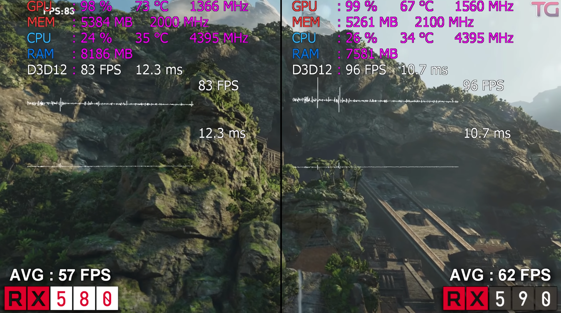 쉐도우 오브 더 툼레이더 매우 높음에서 돌렸을 때 FHD 기준으로 각 평균 프레임은 57, 62로 RX590이 RX580에 대비하여 약 9% 우세한 성능을 보여주었습니다.