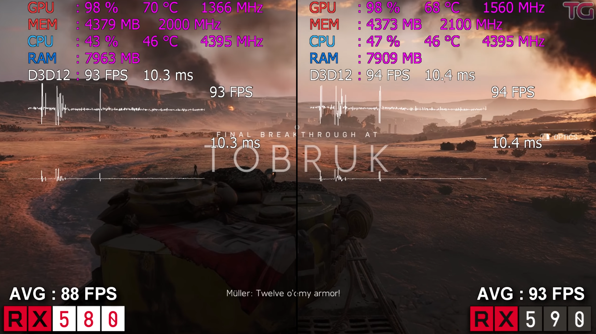 배틀필드 5 울트라에서 돌렸을 때 FHD 기준으로 각 평균 프레임은 88, 93으로 RX590이 RX580에 대비하여 약 5% 우세한 성능을 보여주었습니다.